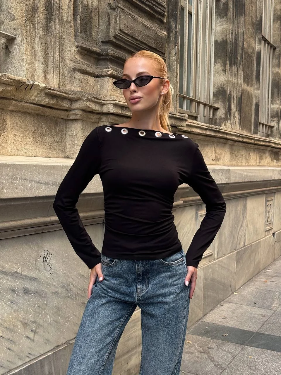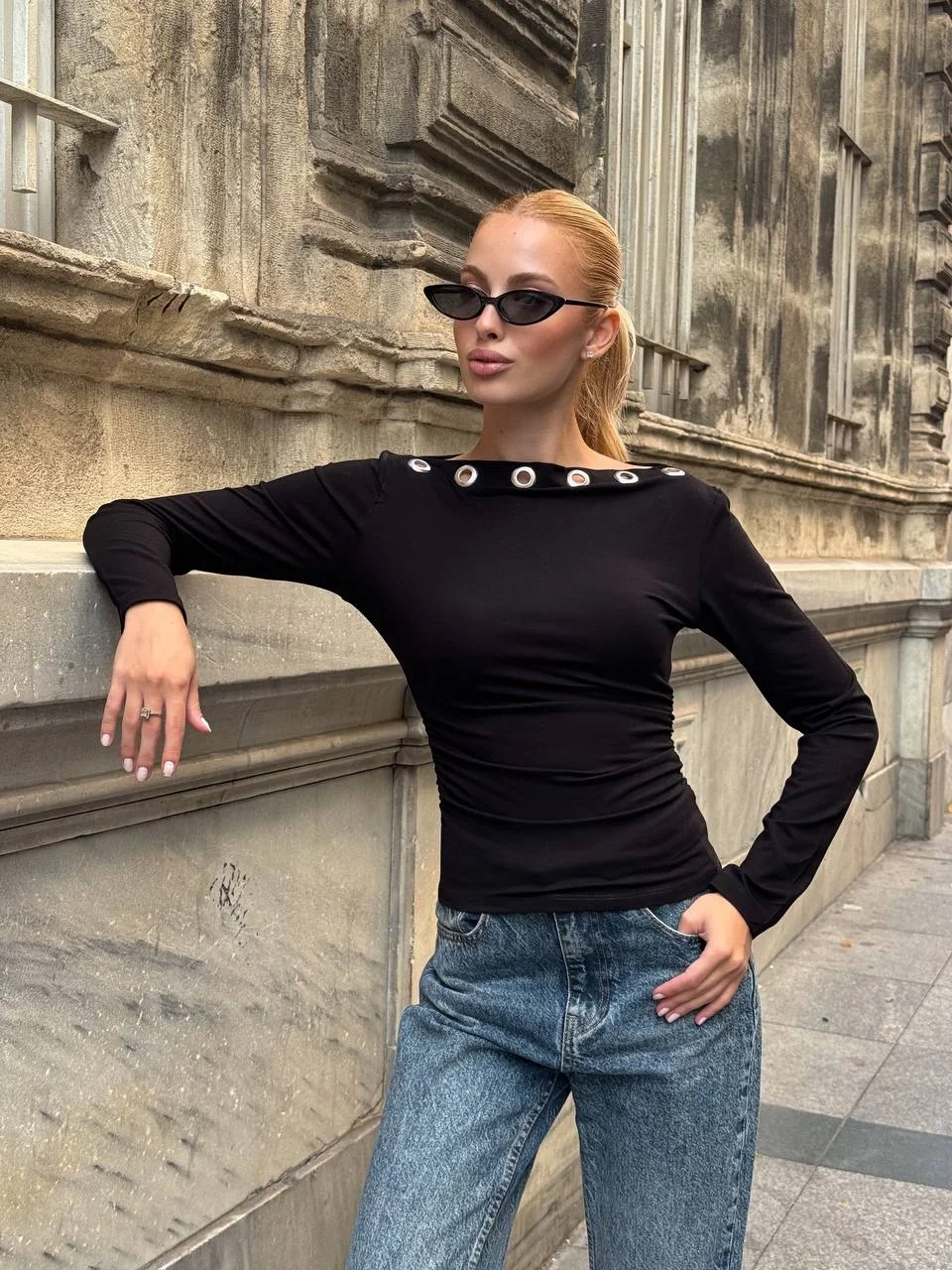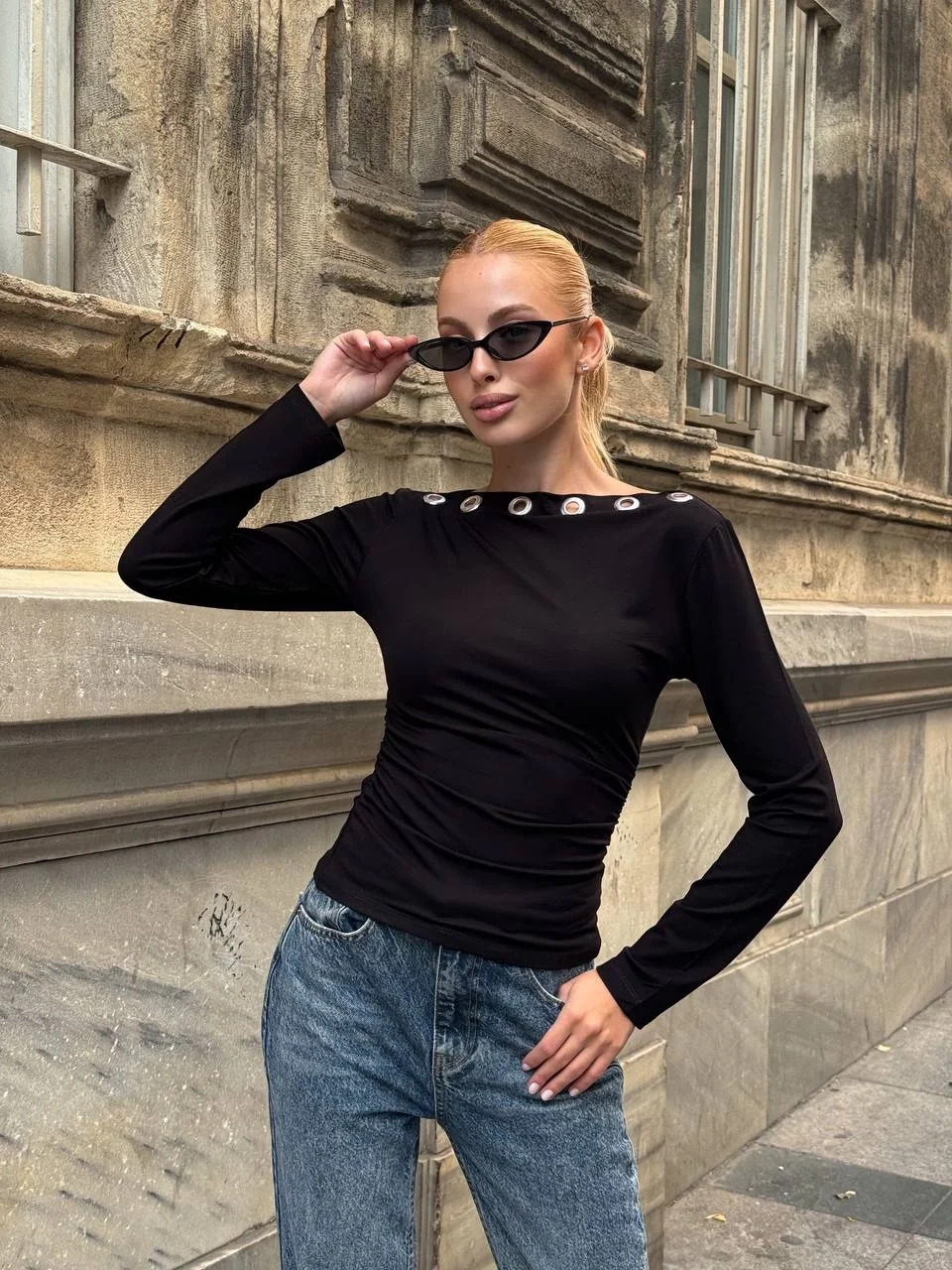Minimal detaylarla tasarlanmış bu özel parça, adını omuz veya yaka kısmındaki kuş gözü (metal halka) aksesuar detaylarından alıyor. Hafif dökümlü yapısı ve modern kesimiyle hem günlük kombinlerinizde hem de özel davetlerde rahatlıkla tercih edebilirsiniz.