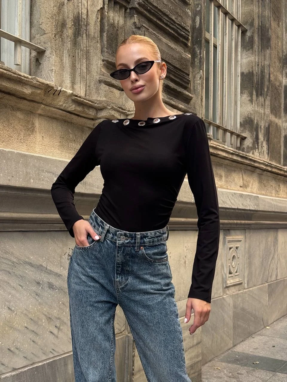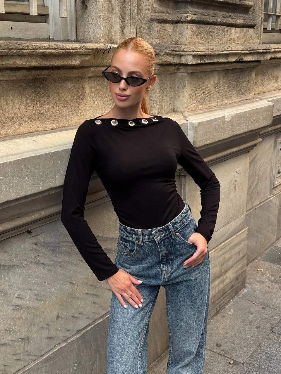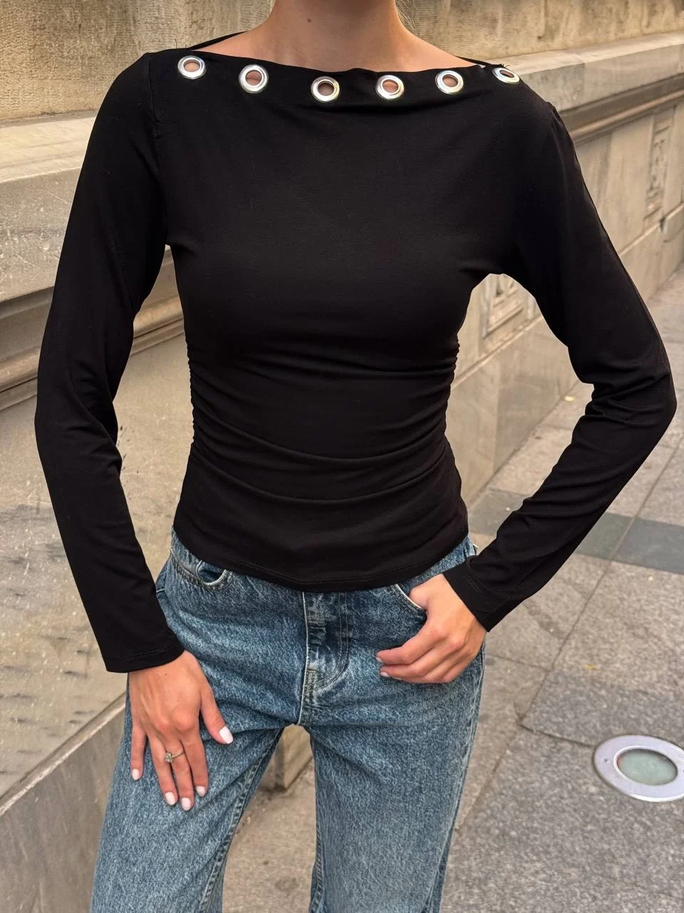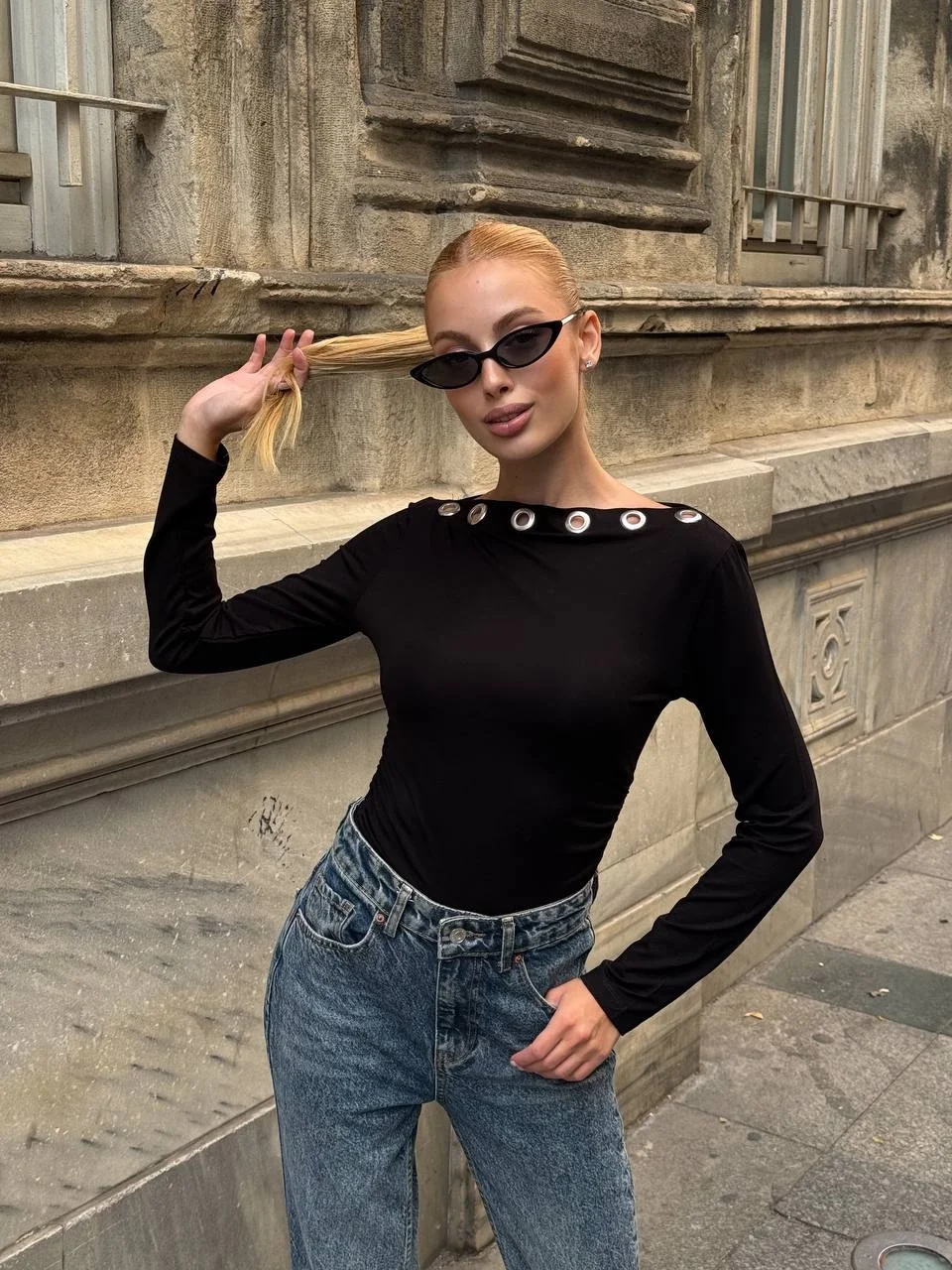Minimal detaylarla tasarlanmış bu özel parça, adını omuz veya yaka kısmındaki kuş gözü (metal halka) aksesuar detaylarından alıyor. Hafif dökümlü yapısı ve modern kesimiyle hem günlük kombinlerinizde hem de özel davetlerde rahatlıkla tercih edebilirsiniz.