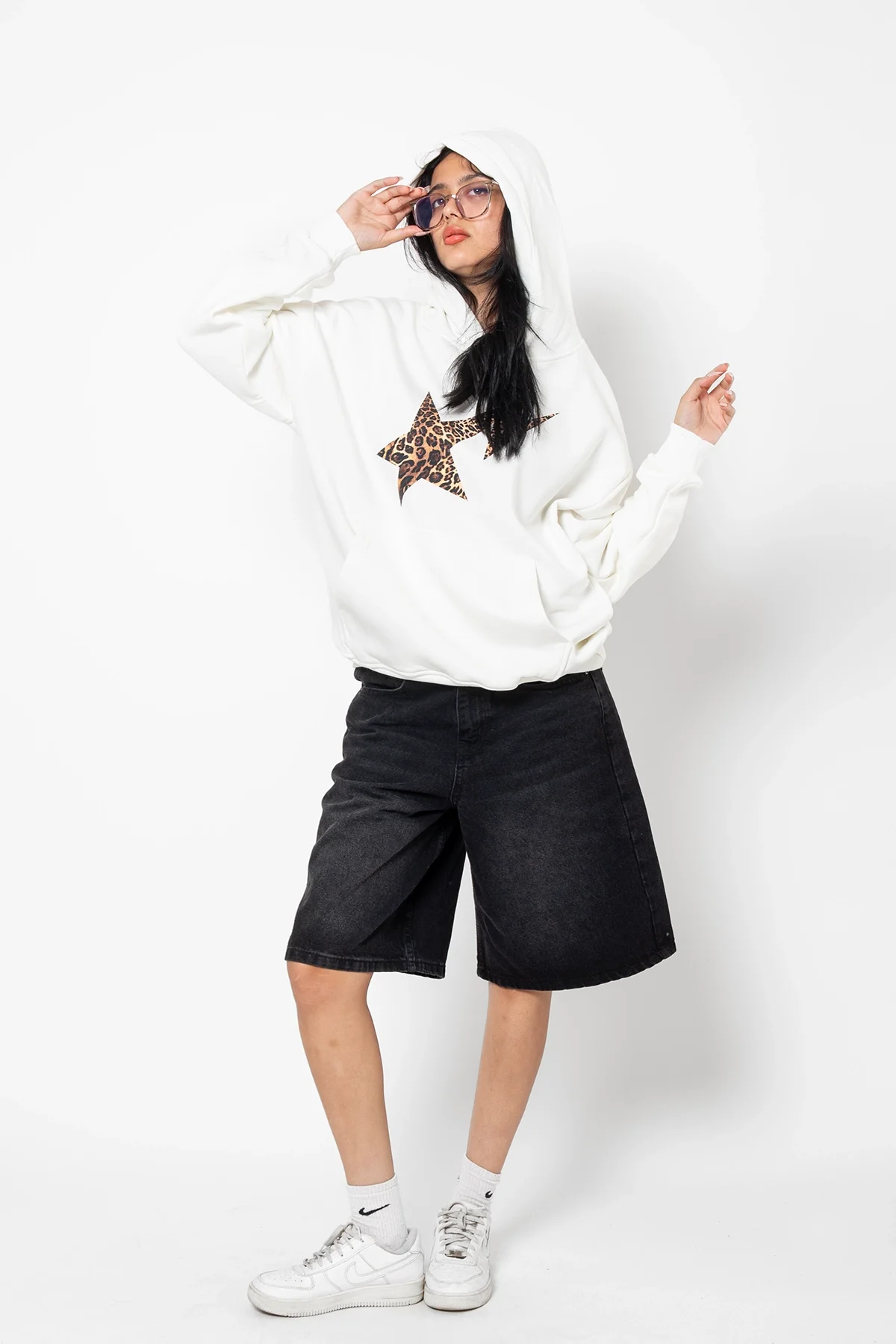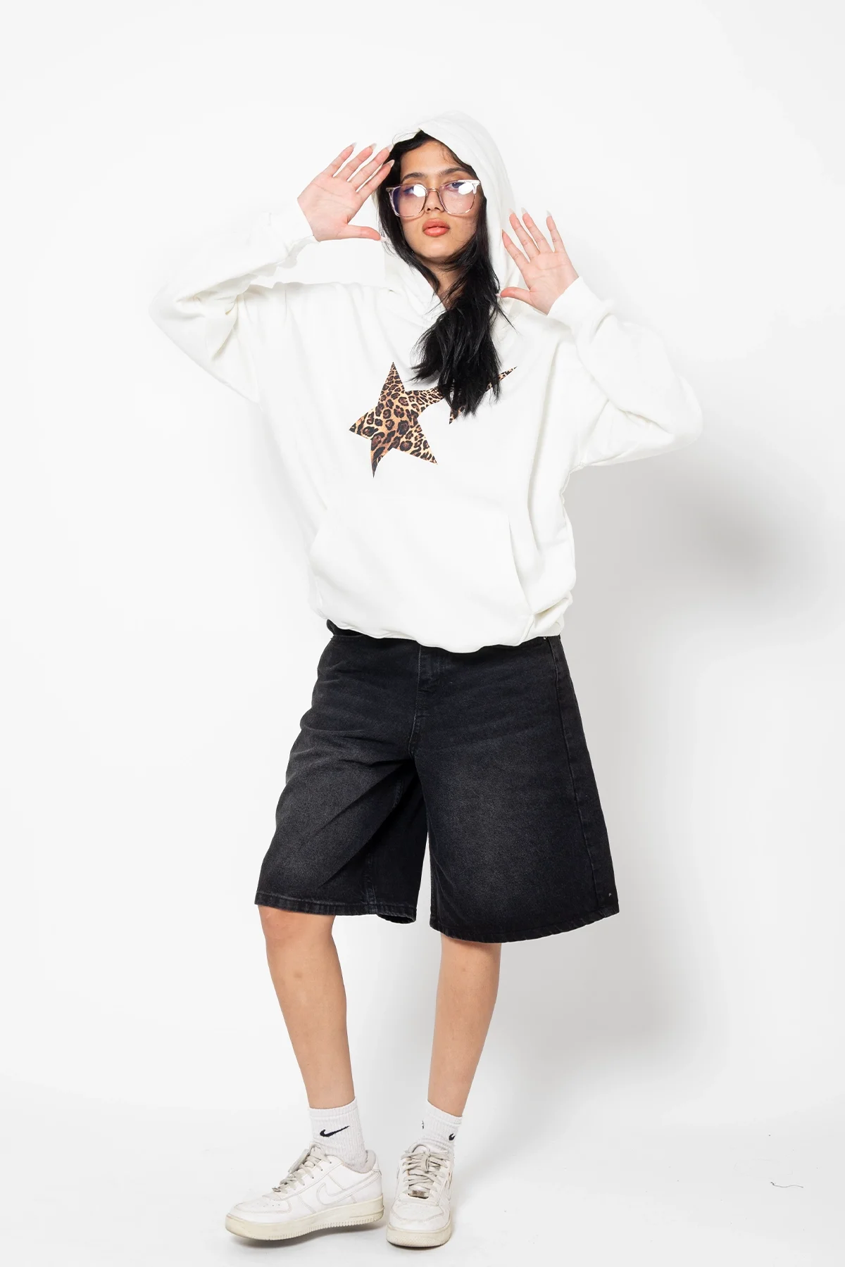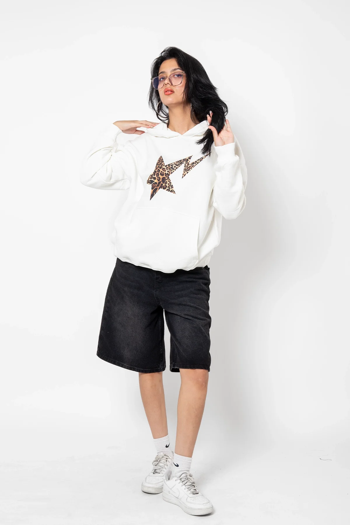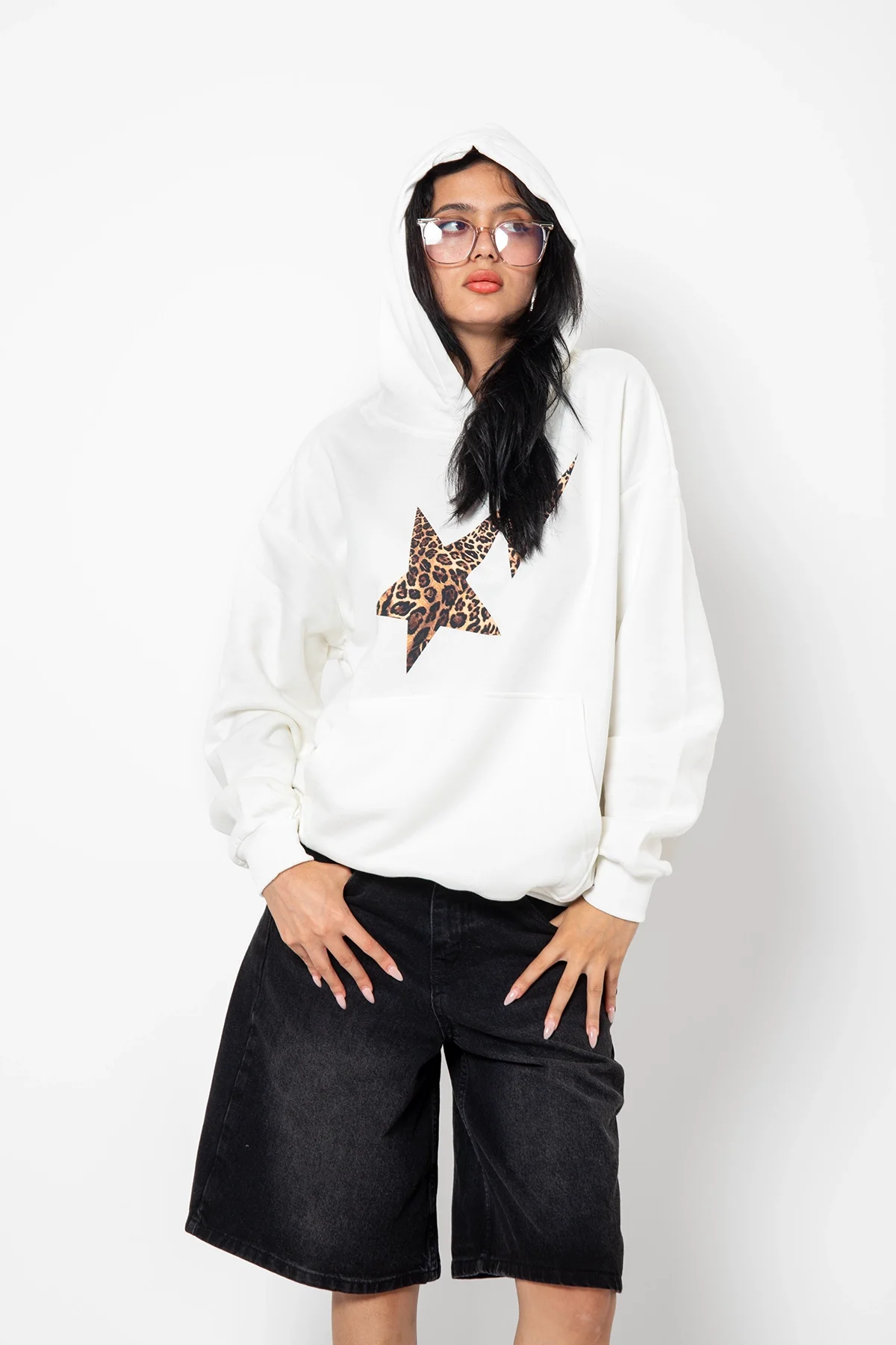 LEOPAR FALLİNG STAR BASKILI OVERSİZE UNİSEX PREMİUM BEYAZ HOODİE