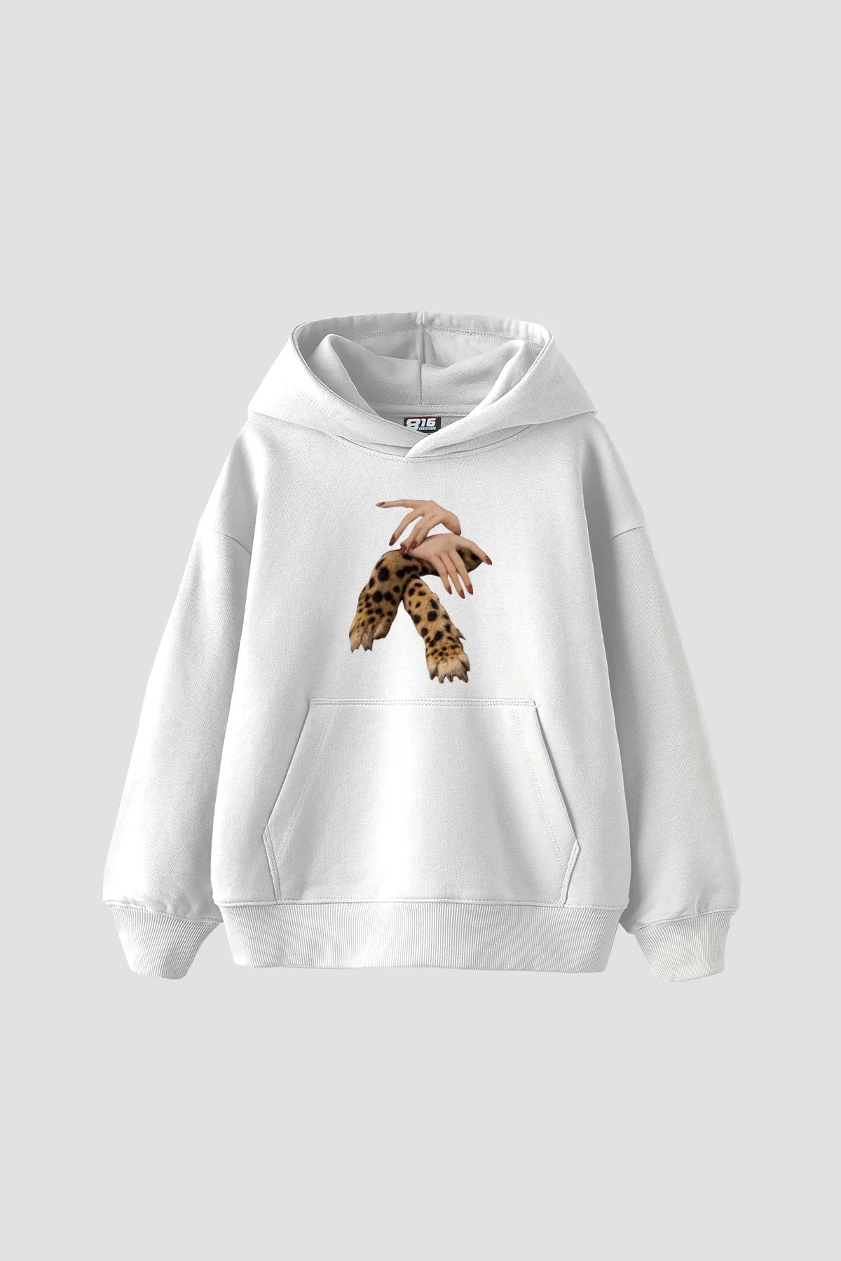 LEOPAR HAND BASKILI OVERSİZE UNİSEX PREMİUM BEYAZ HOODİE