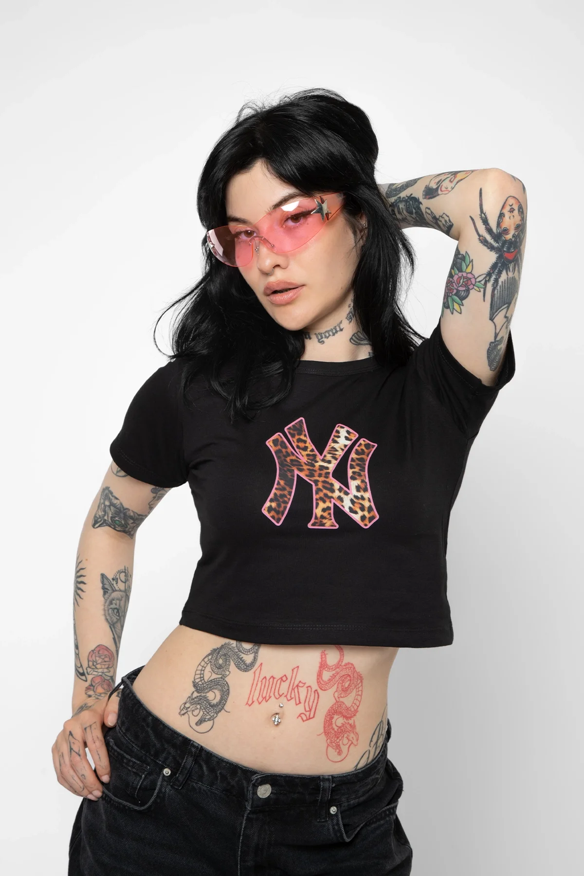 Leopar Ny baskılı siyah crop top ile kendinizi özgür ve şık hissedin, Bak Moda'nın kalitesi ile tarzınızı ön plana çıkarın!