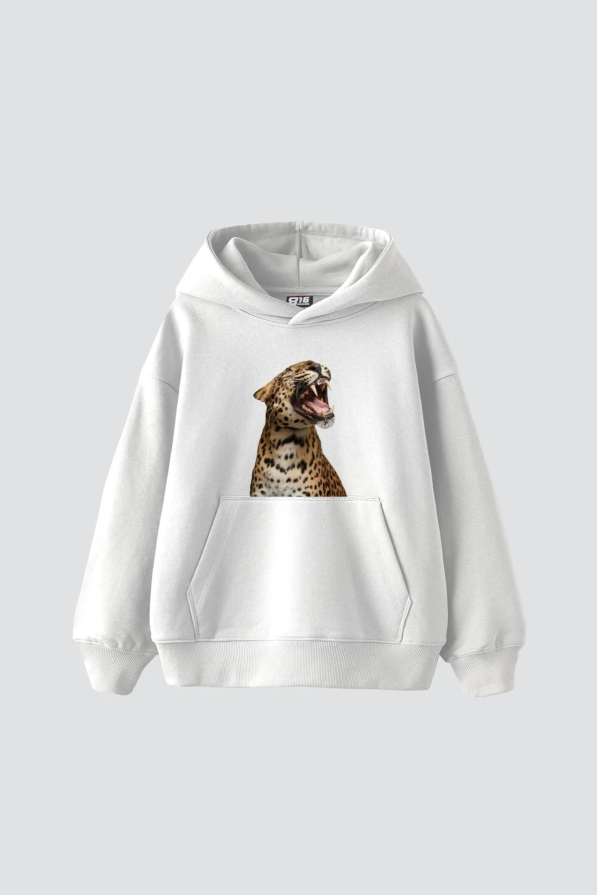 LEOPARD SİLUET BASKILI OVERSİZE UNİSEX PREMİUM BEYAZ HOODİE