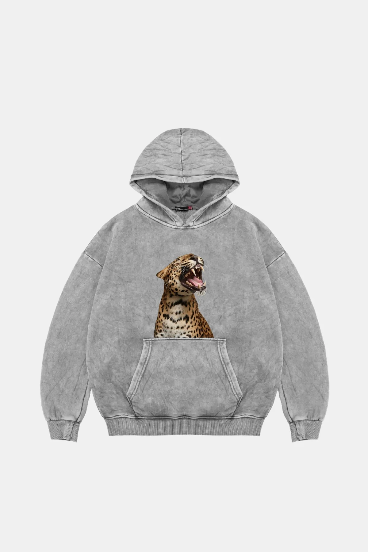 LEOPARD SİLÜET BASKILI OVERSİZE UNİSEX PREMİUM YIKAMALI BEYAZ HOODİE