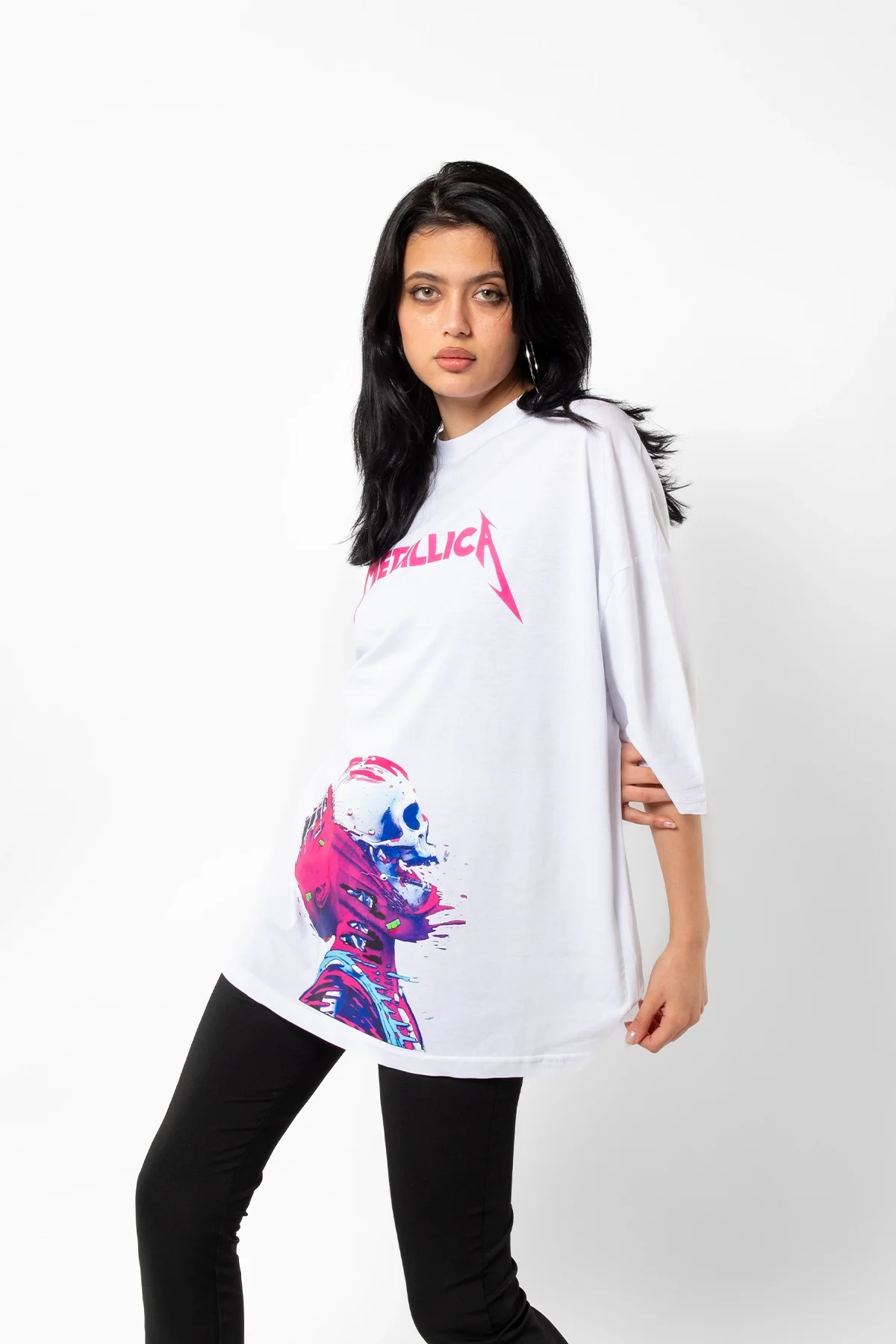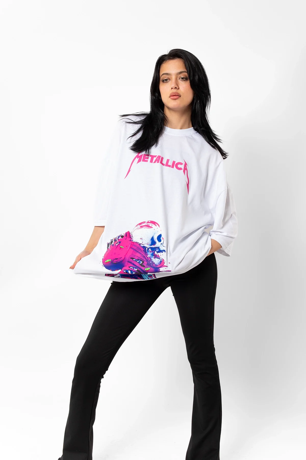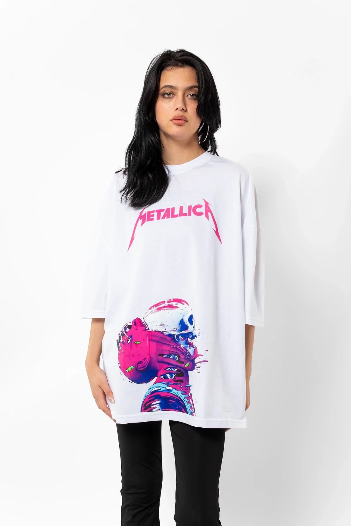 METALLİCA NEON PEMBE BASKILI BEYAZ UNİSEX OVERSİZE TSHİRT