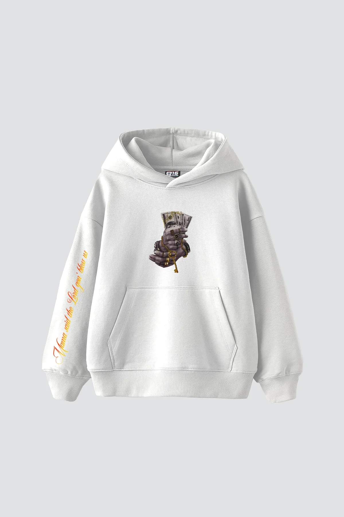 MONEY HAND BASKILI OVERSİZE UNİSEX PREMİUM BEYAZ HOODİE