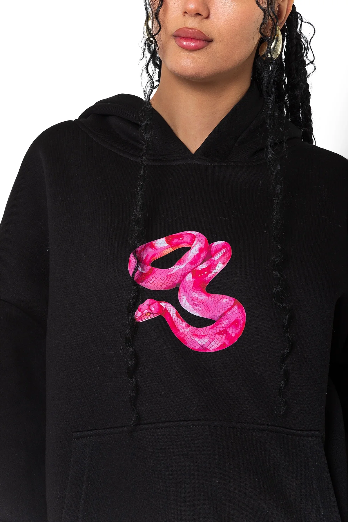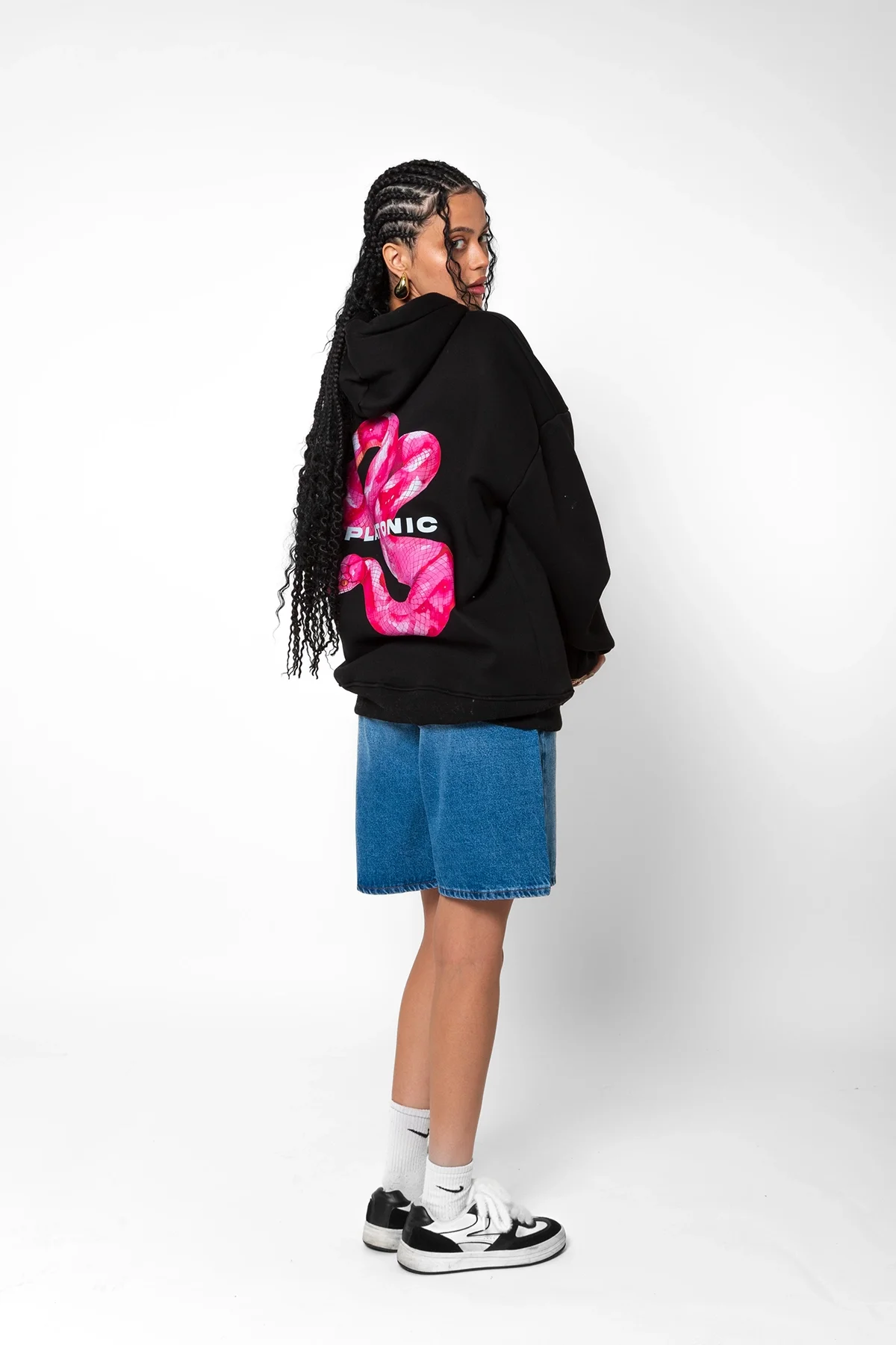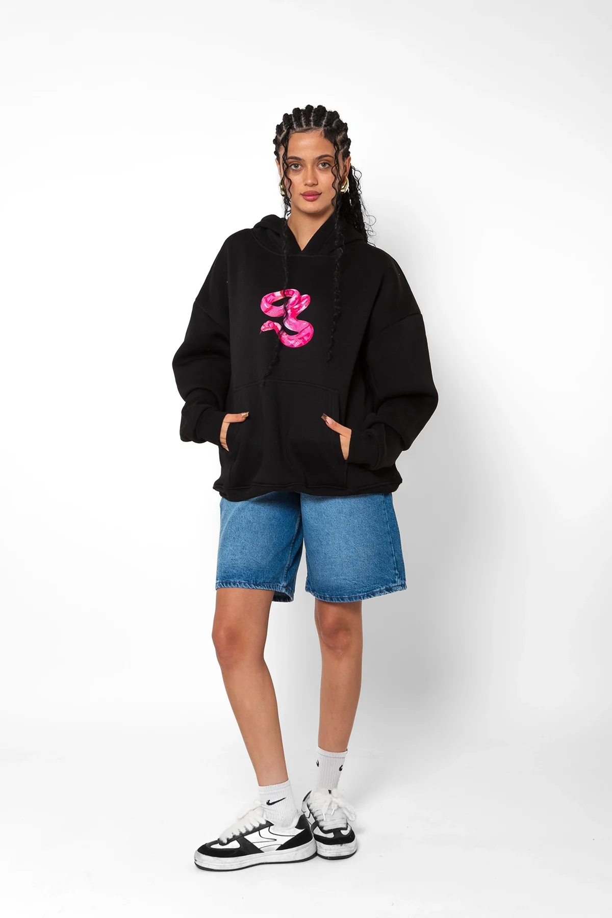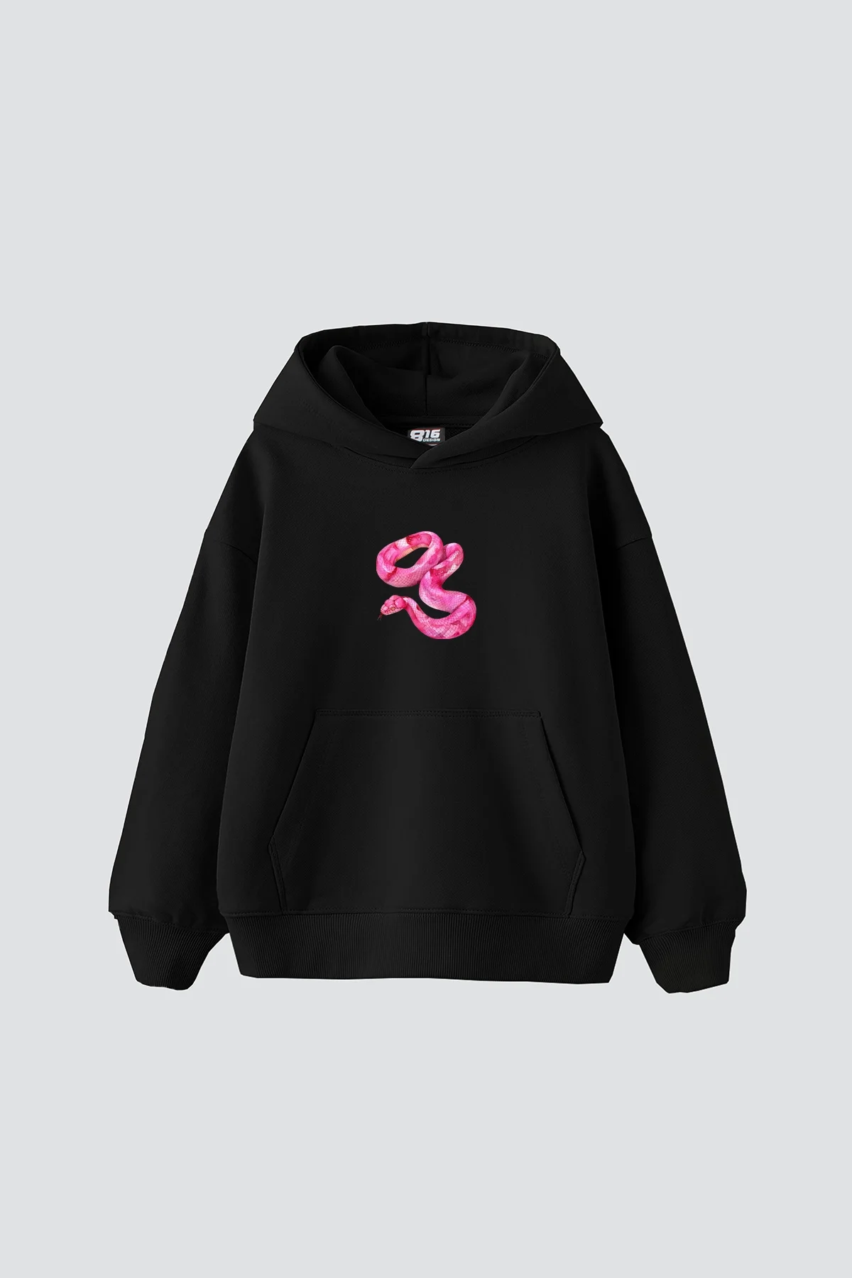 Seven-Headed Serpent Baskılı Oversize Unisex Siyah Hoodie