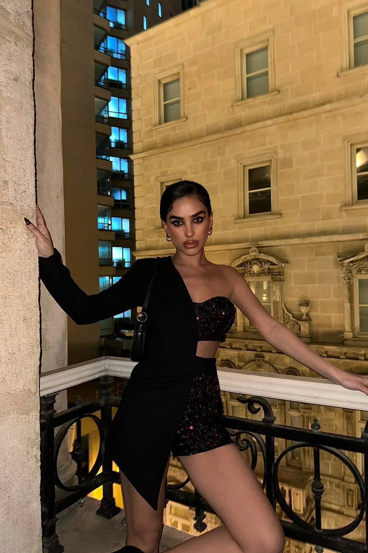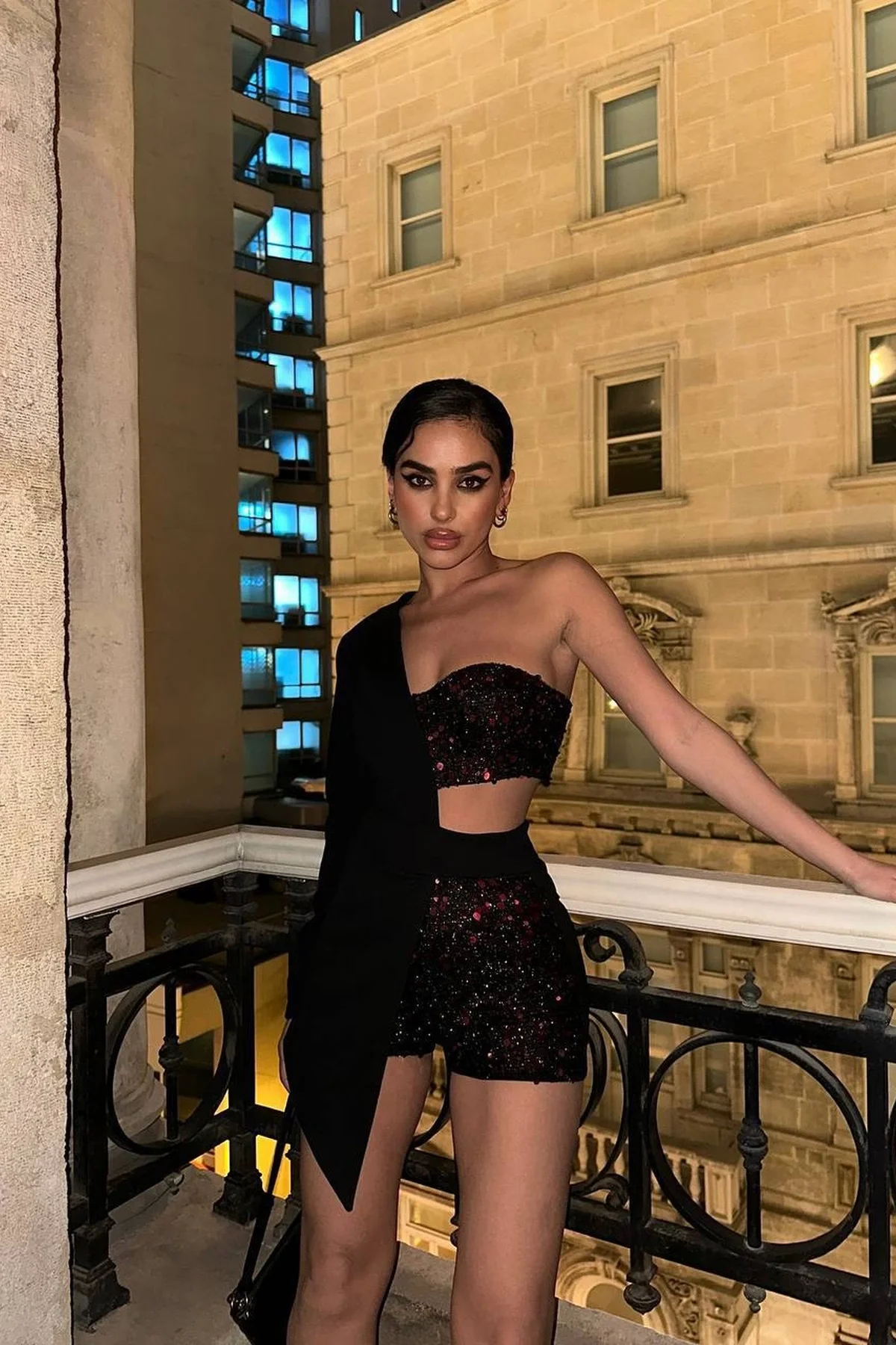 Geceye damganızı vurmak istiyorsanız, bu elbise tam size göre! Baştan sona kırmızı pullarla bezenmiş tasarımıyla ışıl ışıl parlayan bu ceket elbise, göz alıcı bir şıklık sunar. Derin göğüs dekoltesiyle cesur ve zarif bir duruş sergilerken, blazer tarzı kesimiyle modern ve güçlü bir görünüm yaratır.