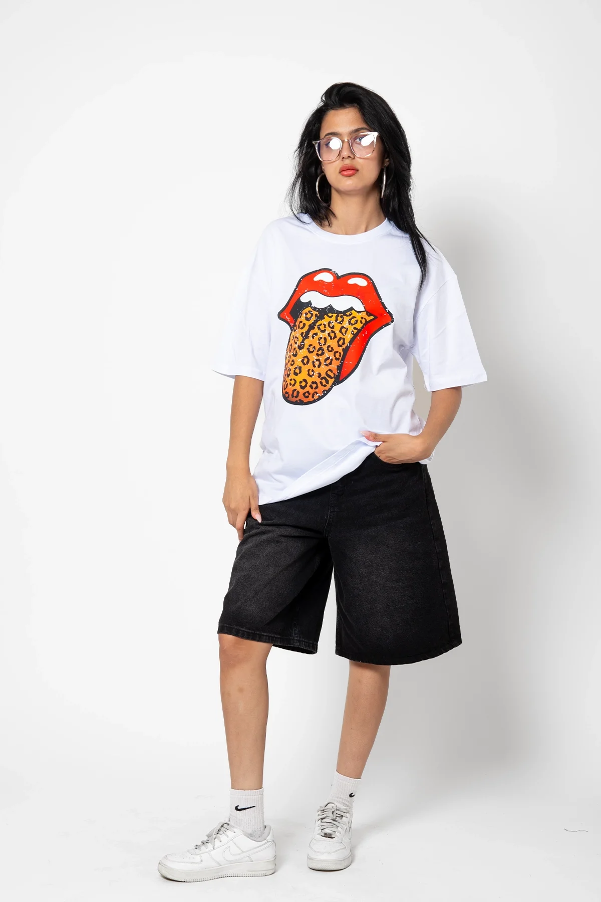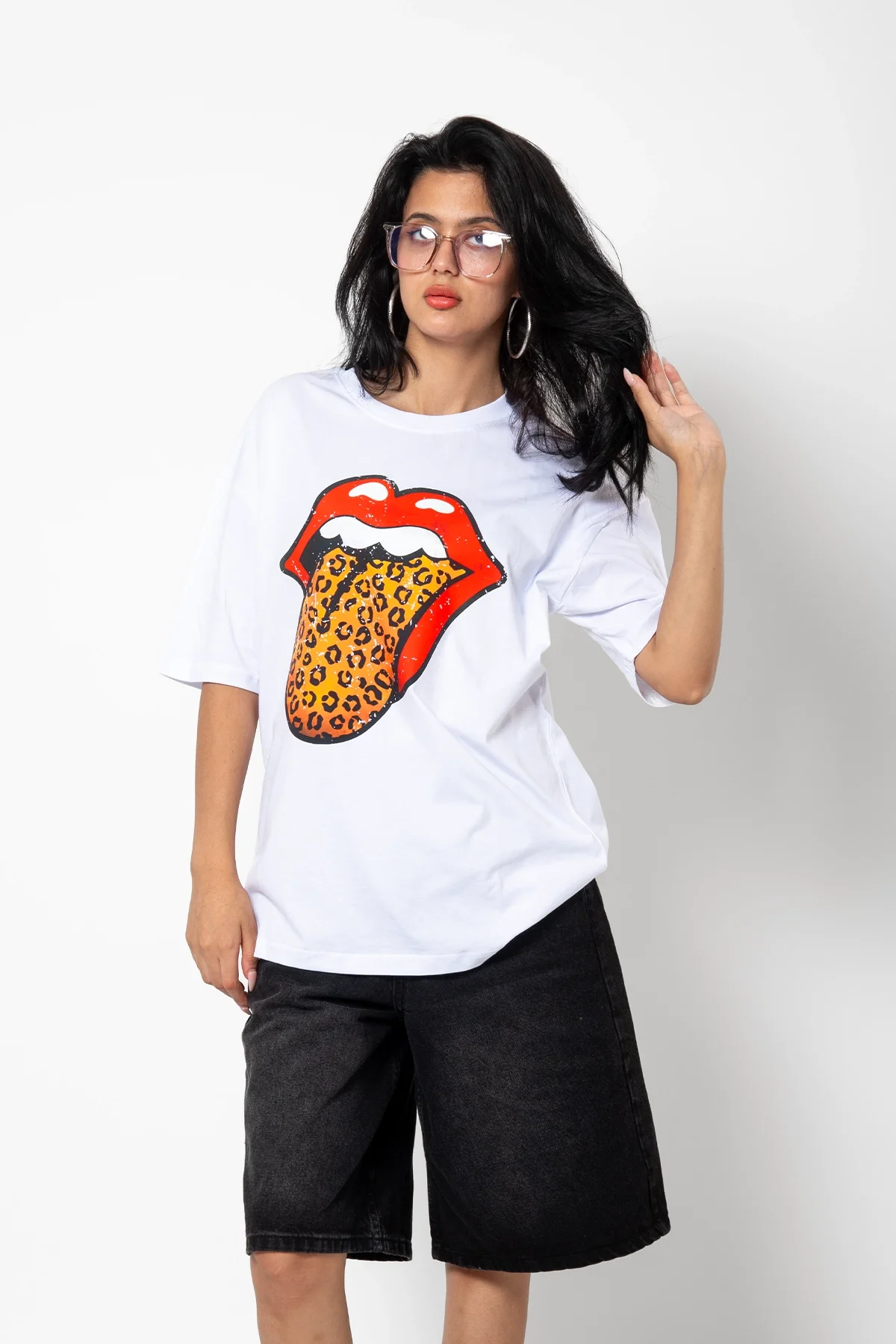ROLLİNG STONES LEOPAR BASKILI OVERSİZE UNİSEX PREMİUM BEYAZ TSHİRT