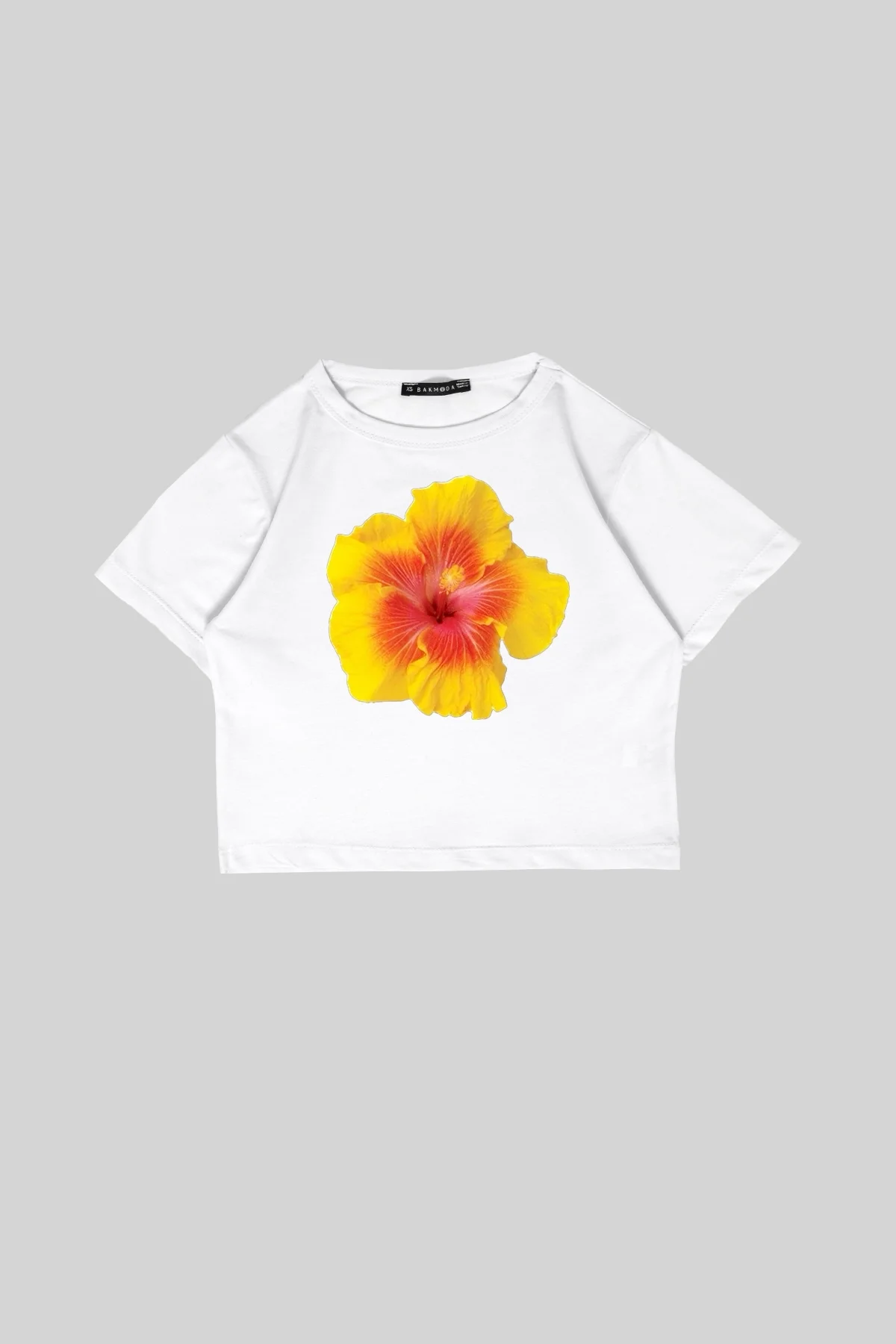 SARI ÇİÇEK BASKILI BEYAZ CROP TOP
