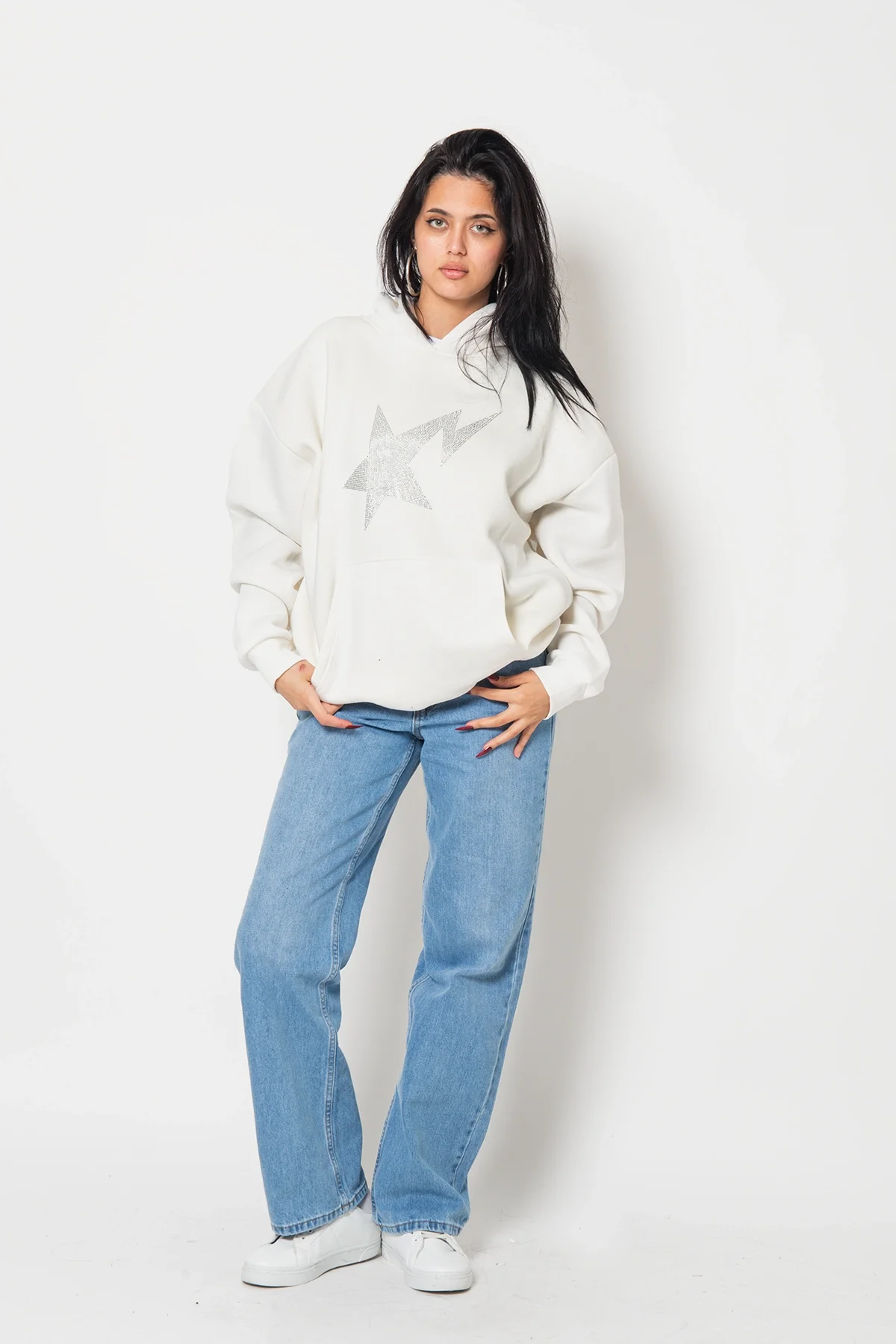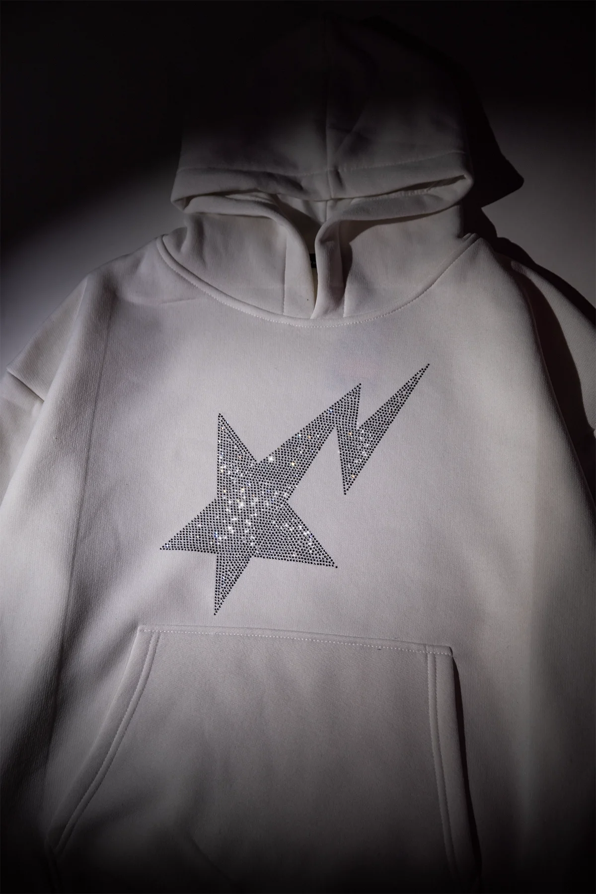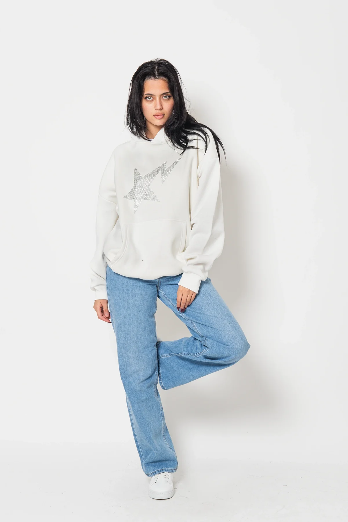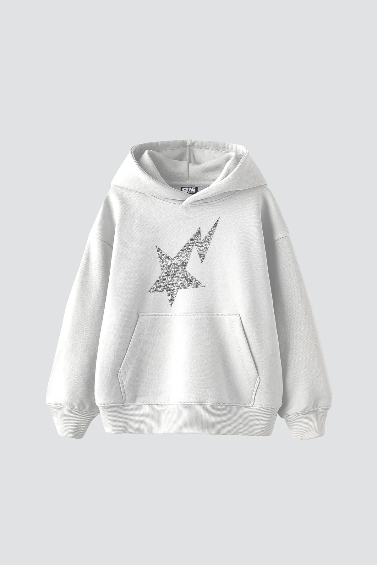 SHİNİNG STAR TAŞ BASKILI OVERSİZE UNİSEX PREMİUM BEYAZ HOODİE