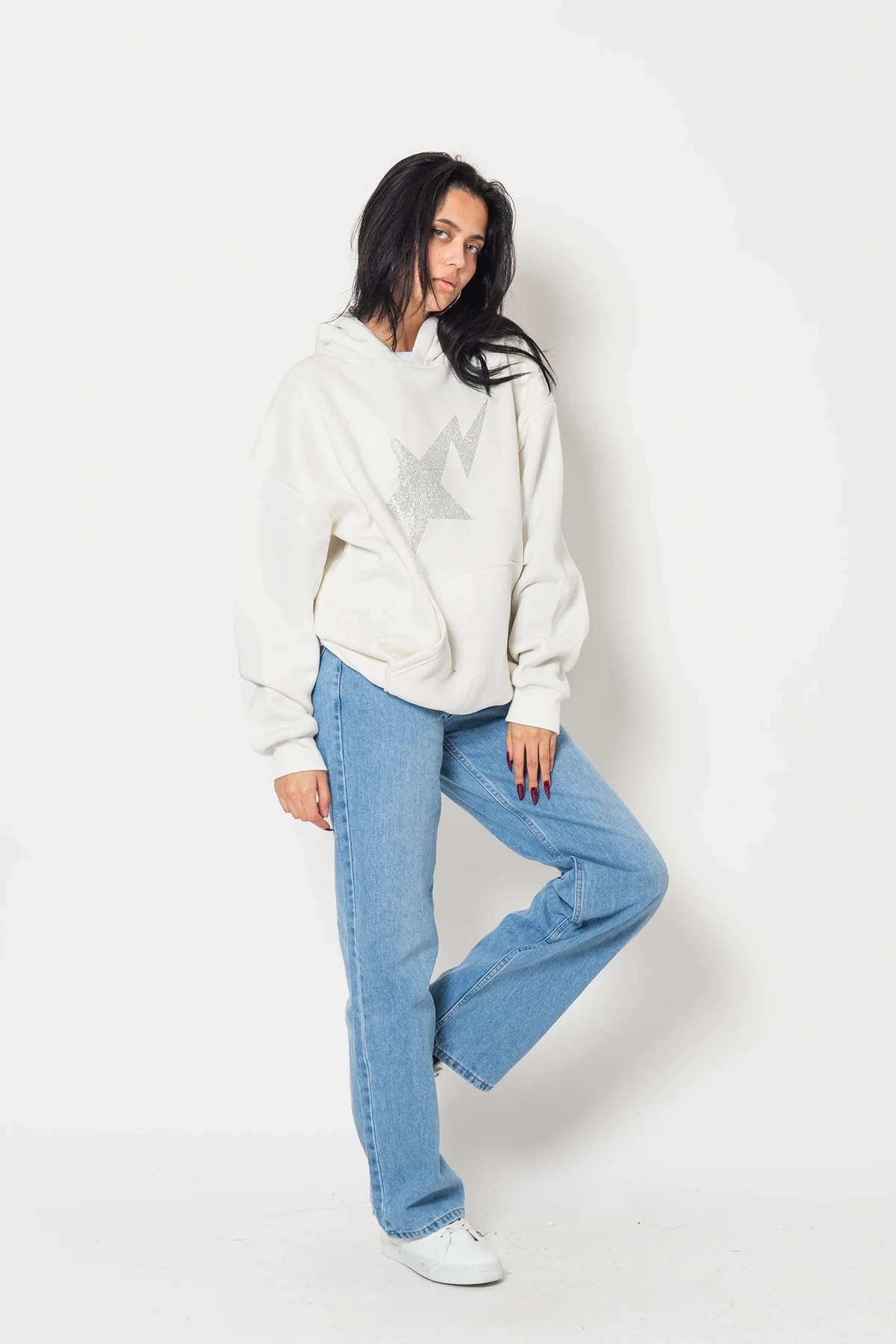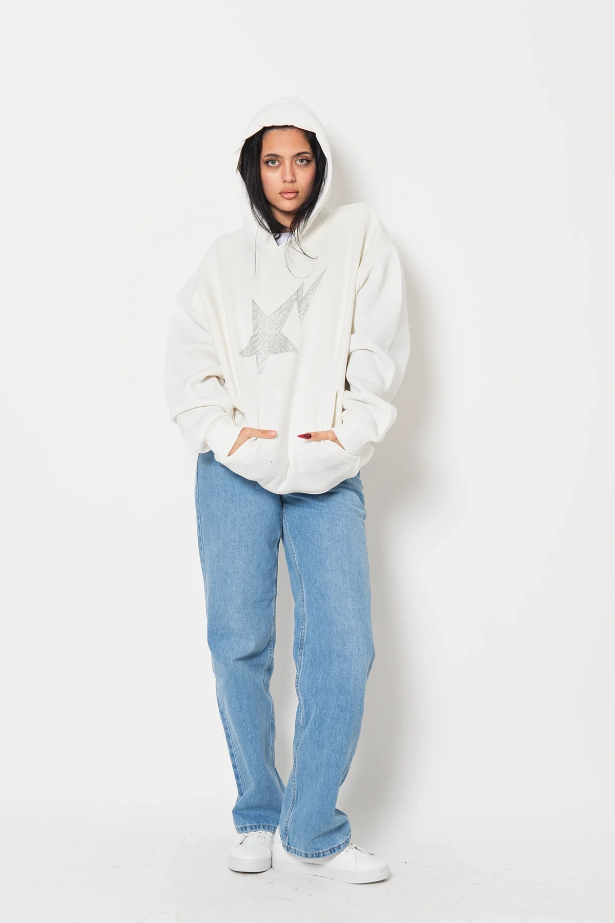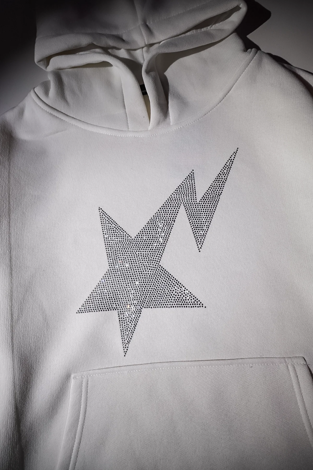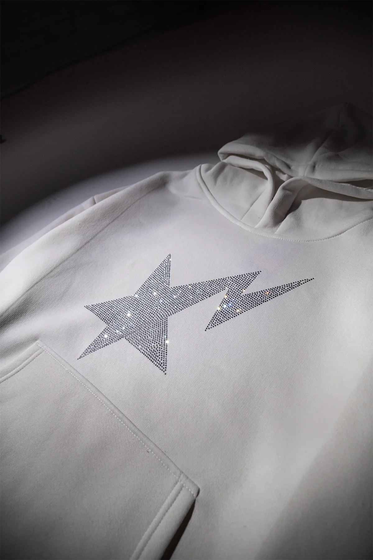 SHİNİNG STAR TAŞ BASKILI OVERSİZE UNİSEX PREMİUM BEYAZ HOODİE