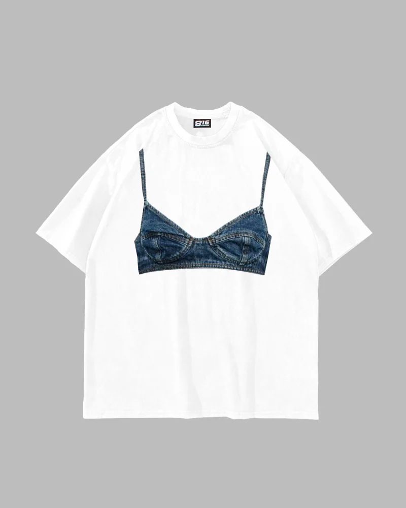 Denim Bra Baskılı Oversize Unisex Beyaz Tshirt