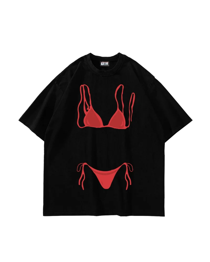 Fiyonk Bikini Baskılı Oversize Unisex Siyah Tshirt