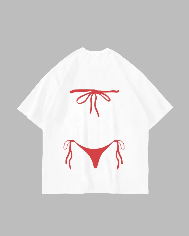 Fiyonk Bikini Baskılı Oversize Unisex Beyaz Tshirt