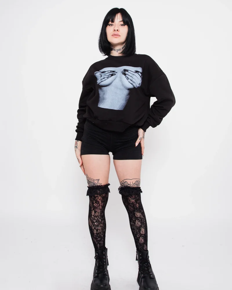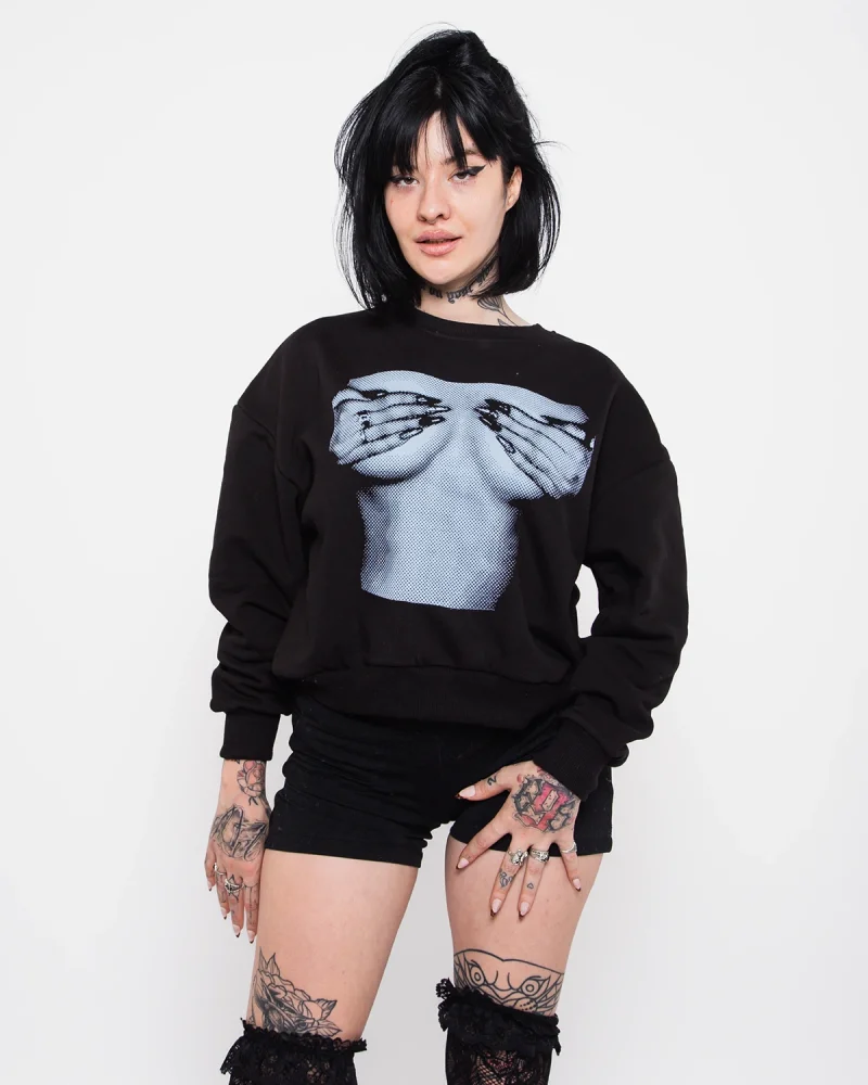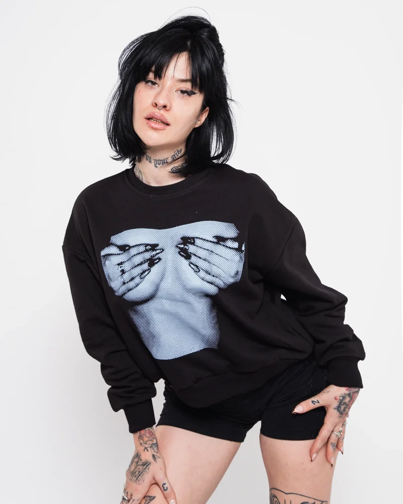 Silhouette Boobs V2 Baskılı Kapüşonsuz Relaxed Fit Kadın Siyah Sweatshirt