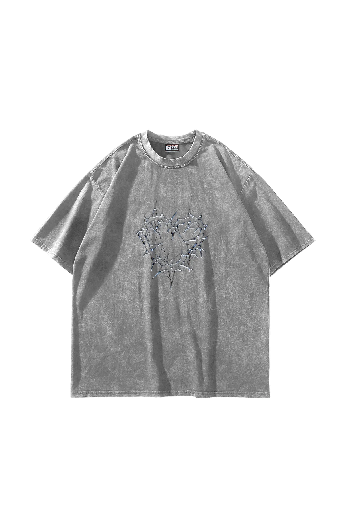 THORNY HEART BASKILI OVERSİZE UNİSEX YIKAMALI BEYAZ TSHİRT