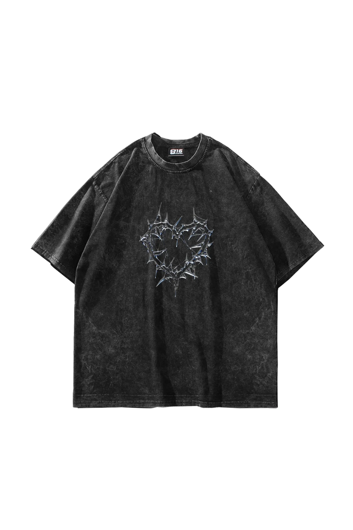 THORNY HEART BASKILI OVERSİZE UNİSEX YIKAMALI SİYAH TSHİRT