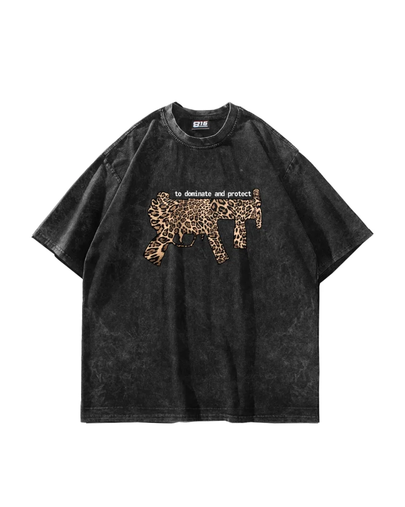 Dominante Leopar Baskılı Oversize Unisex Yıkamalı Siyah Tshirt