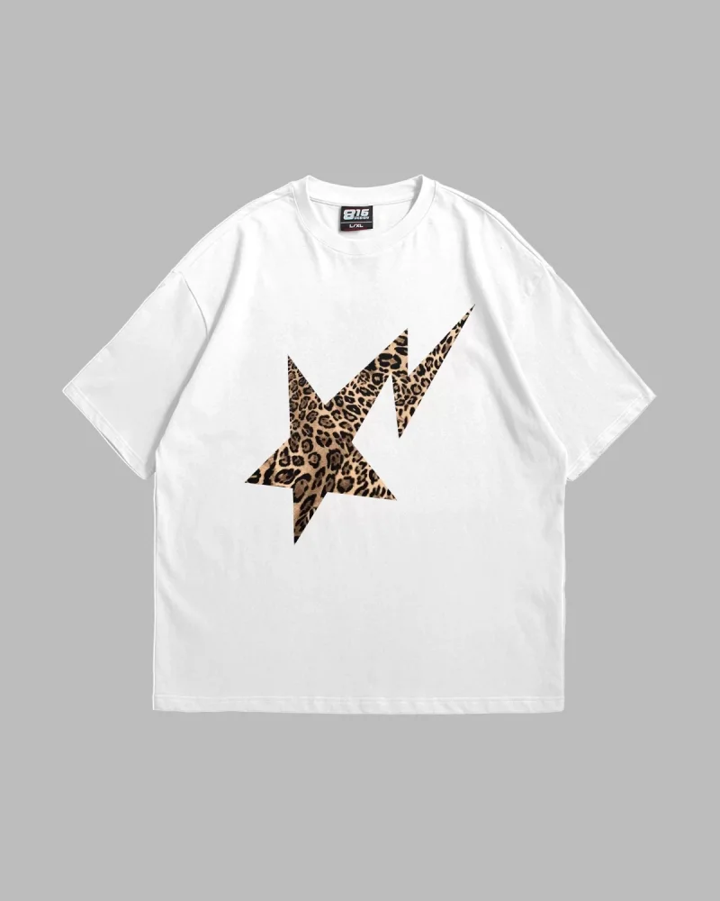Leopar Falling Star Oversize Unisex Beyaz Tshirt