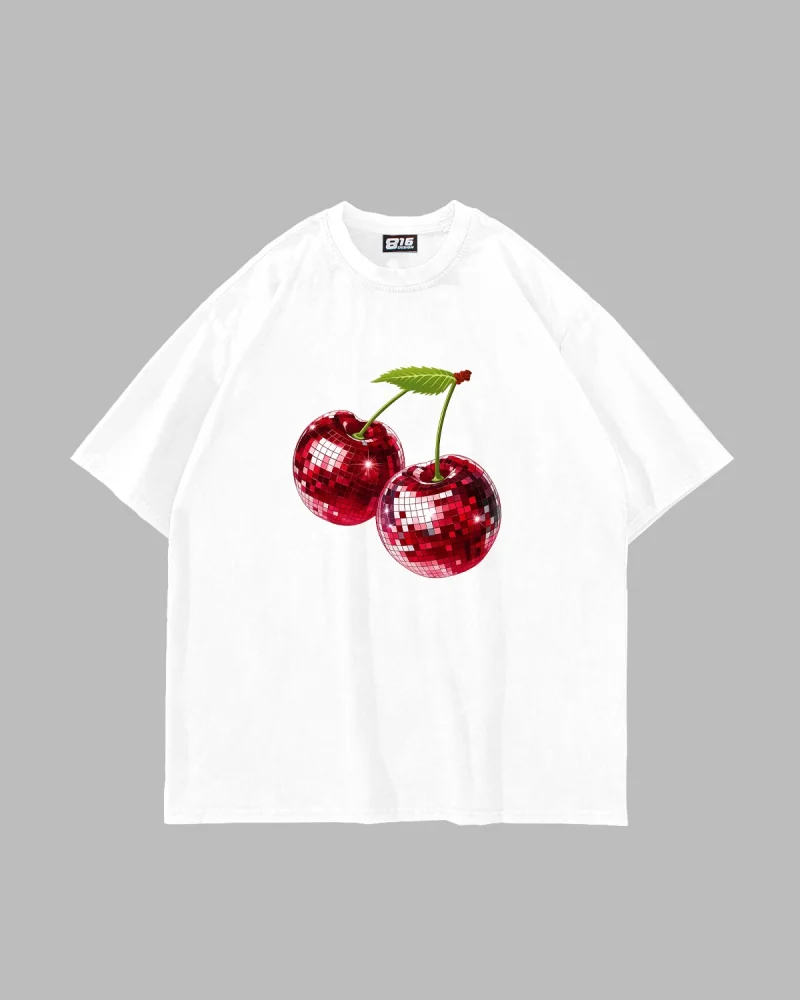 Disco Cherry Baskılı Oversize Unisex Beyaz Tshirt