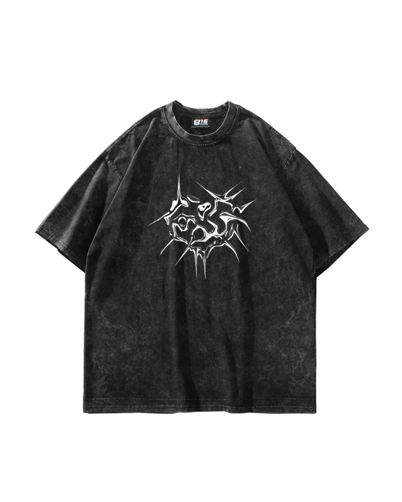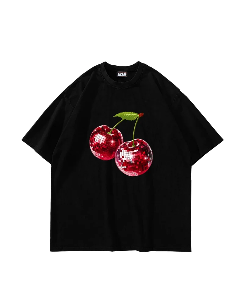 Disco Cherry Baskılı Oversize Unisex Yıkamalı Siyah Tshirt