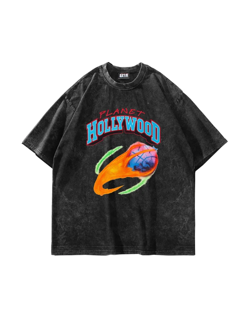 Hollywood Planet Baskılı Oversize Unisex Yıkamalı Siyah Tshirt