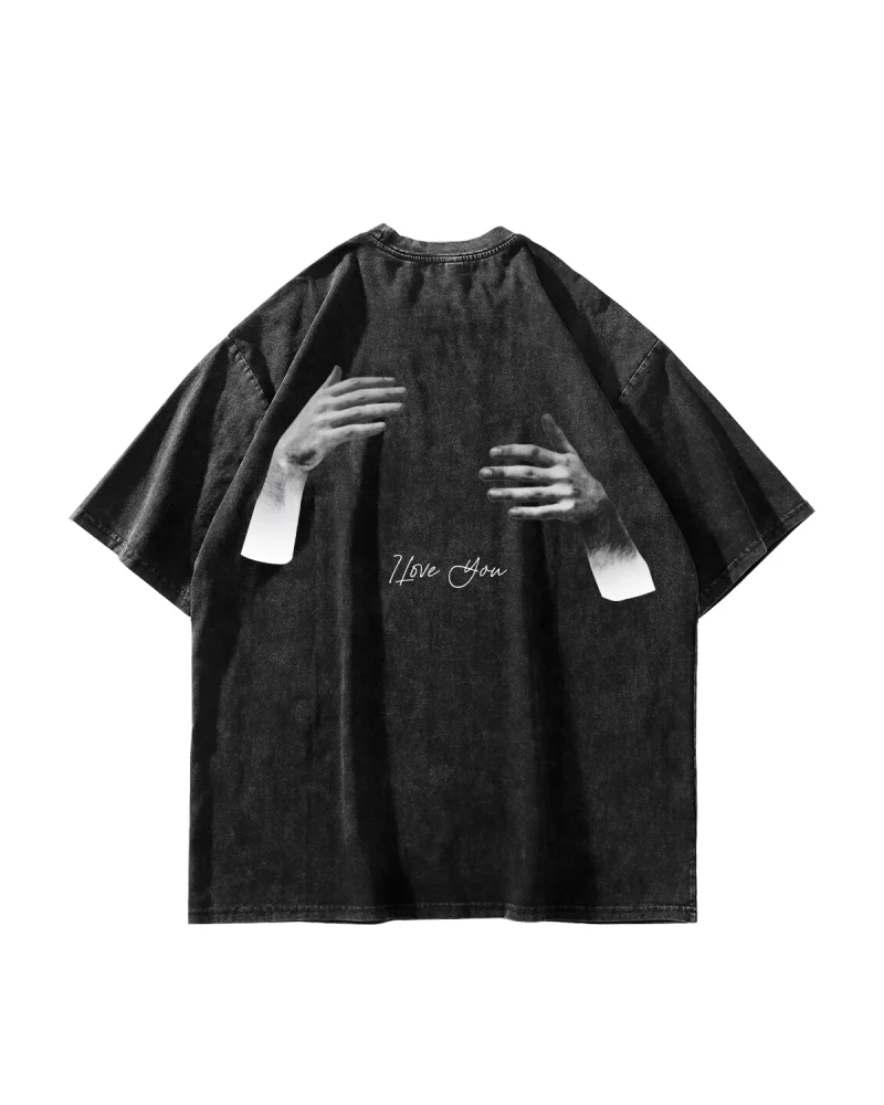 I Love You Baskılı Oversize Unisex Yıkamalı Siyah Tshirt