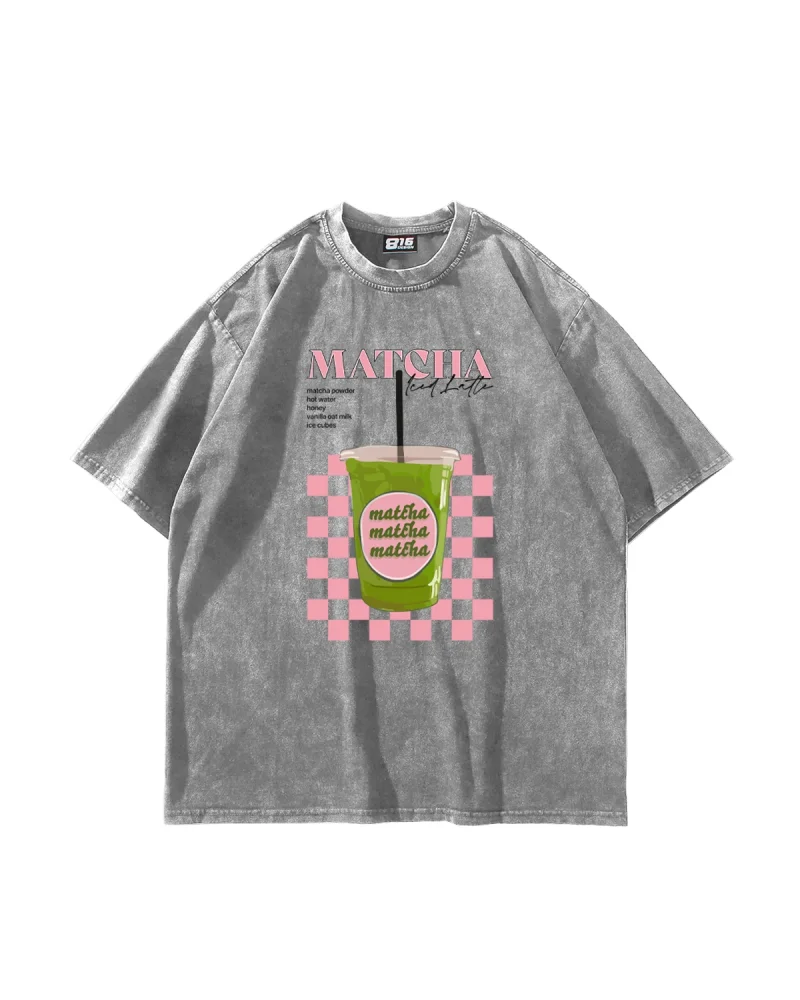 Matcha Iced Latte Baskılı Oversize Unisex Yıkamalı Beyaz Tshirt