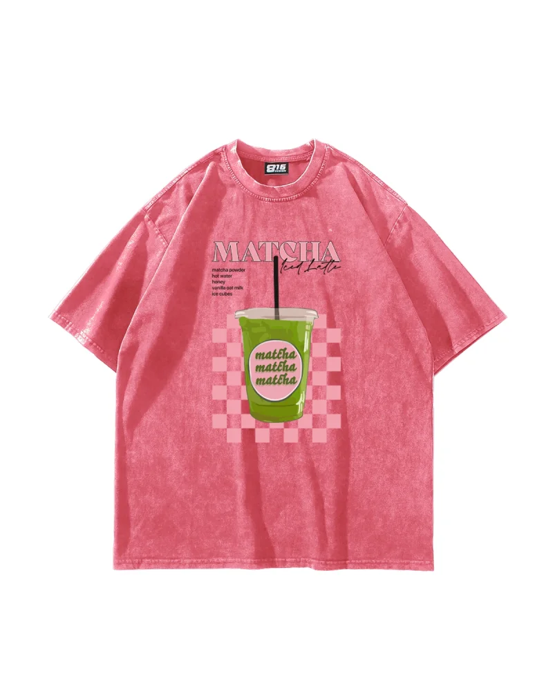 Matcha Iced Latte Baskılı Oversize Unisex Yıkamalı Pembe Tshirt