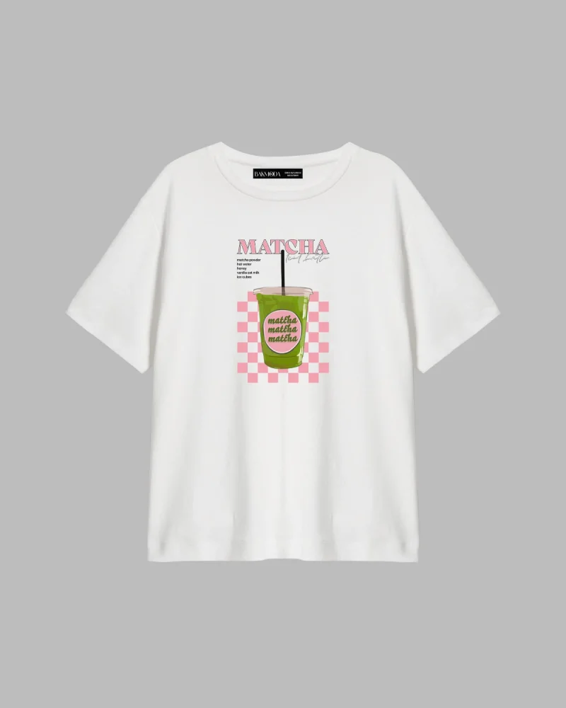 Matcha Iced Latte Baskılı Relaxed Fit Beyaz Kadın Tshirt