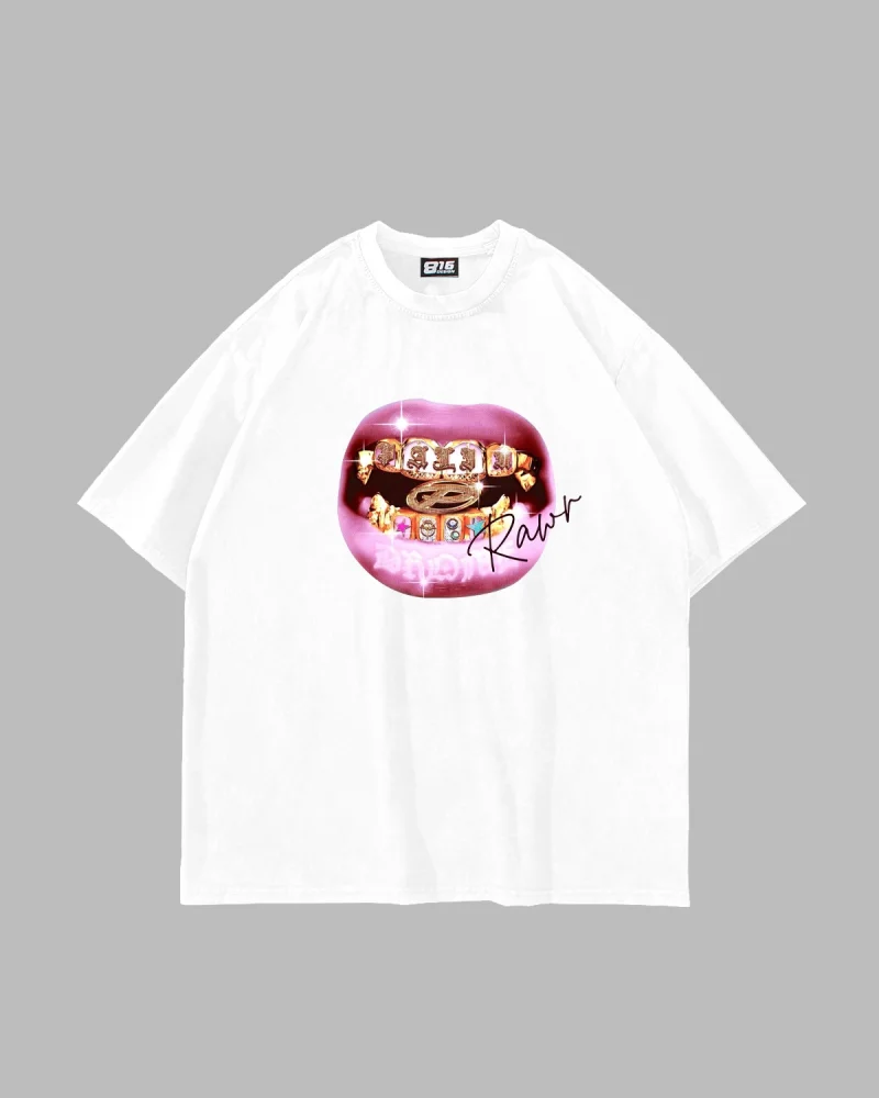 Rawr Teeth Baskılı Oversize Unisex Beyaz Tshirt