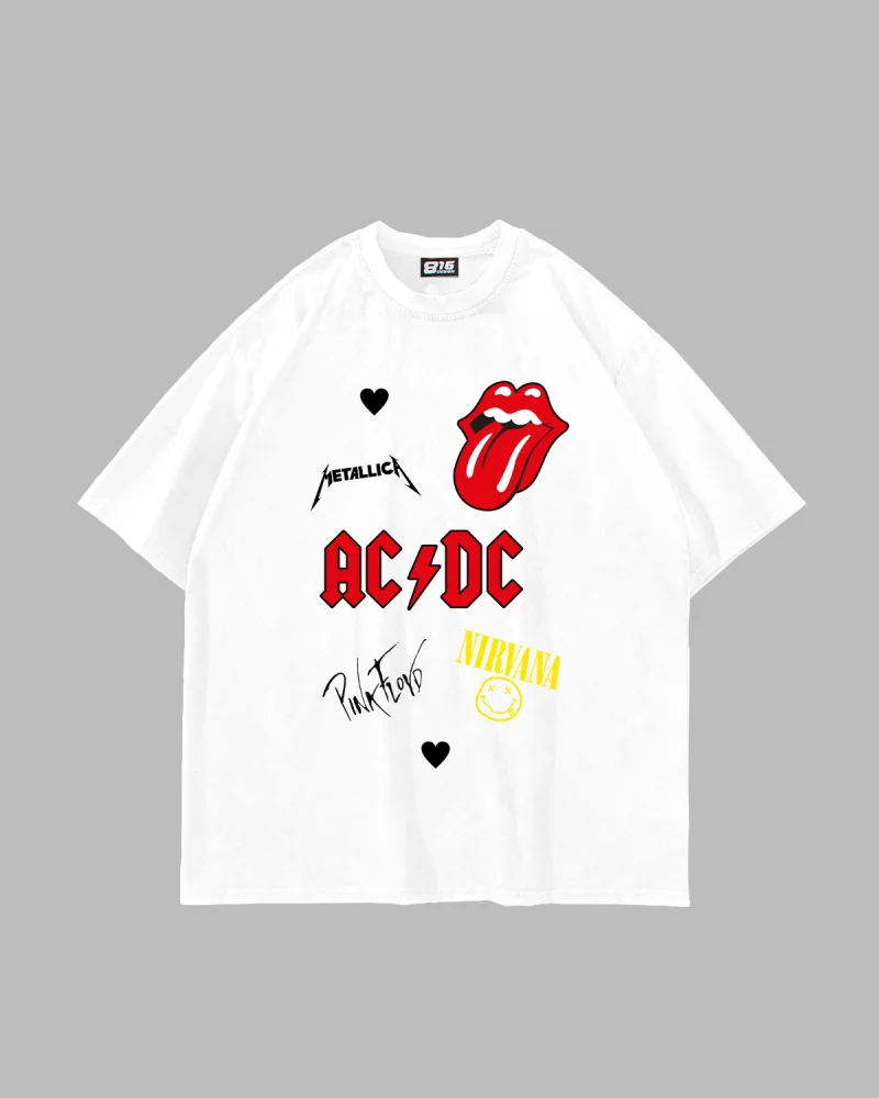 Rock N Roll Baskılı Oversize Unisex Beyaz Tshirt