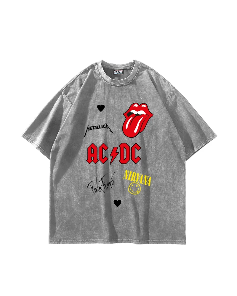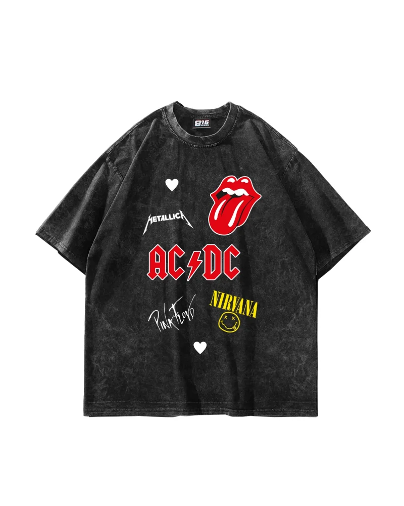 Rock N Roll Baskılı Oversize Unisex Yıkamalı Siyah Tshirt