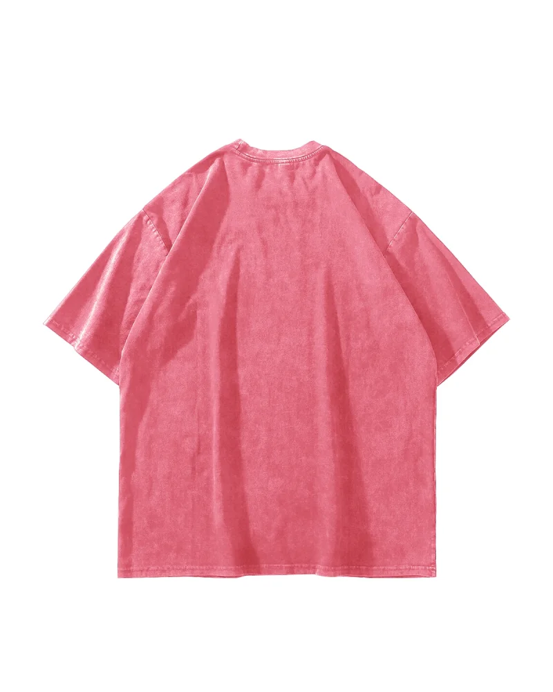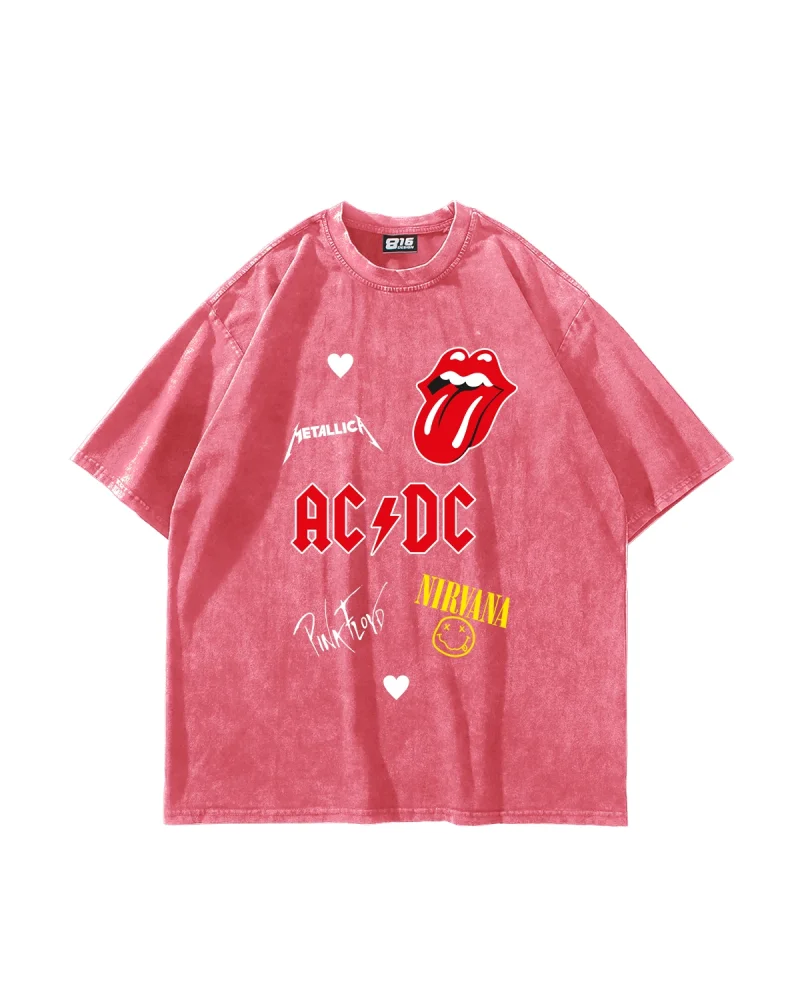 Rock N Roll Baskılı Oversize Unisex Yıkamalı Pembe Tshirt