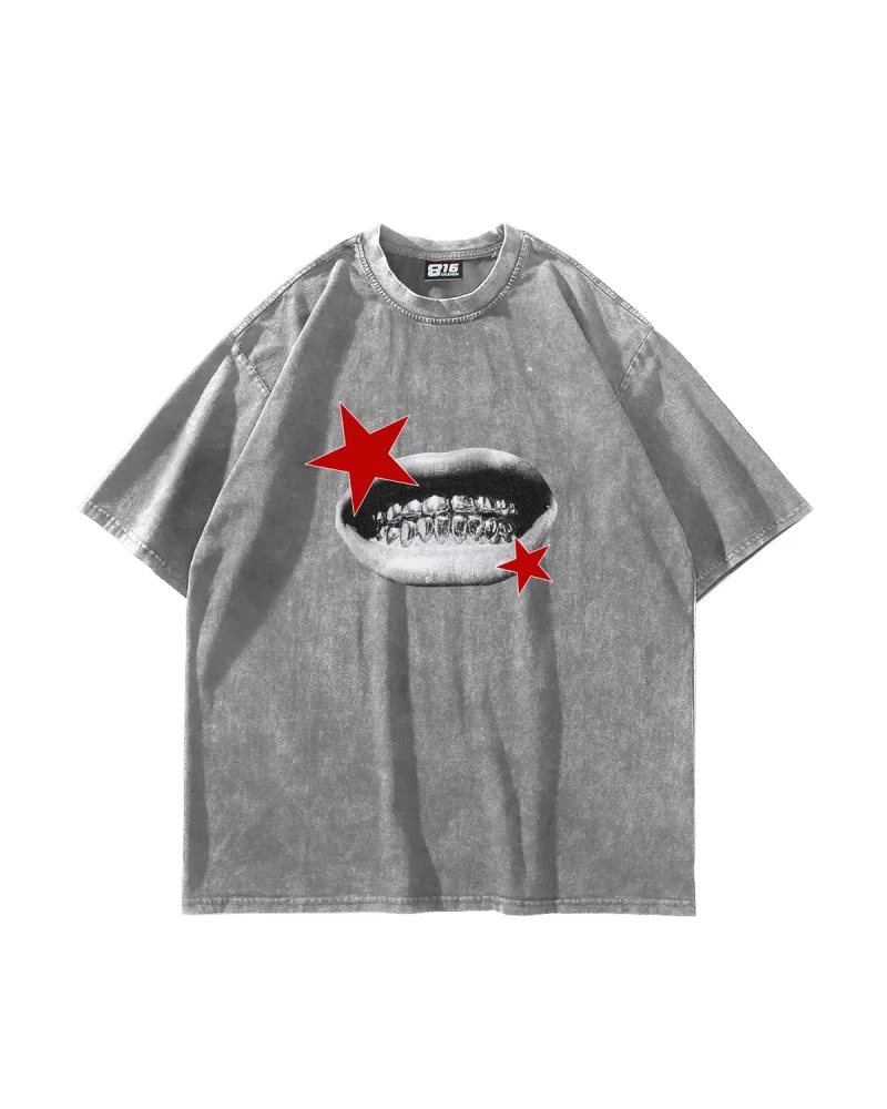 Teeth Star Baskılı Oversize Unisex Yıkamalı Siyah Tshirt