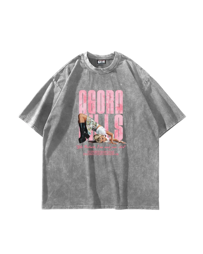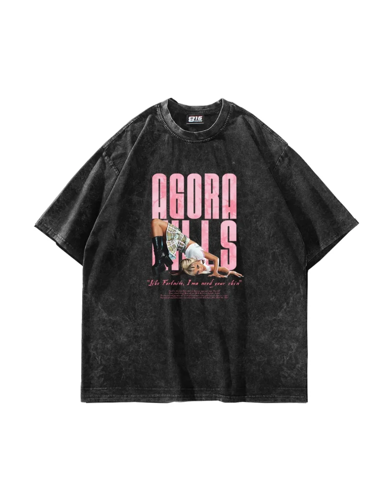 Agora Hills Baskılı Oversize Unisex Yıkamalı Siyah Tshirt