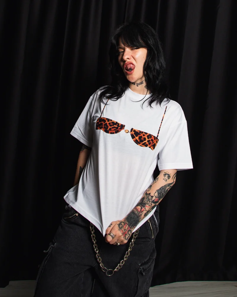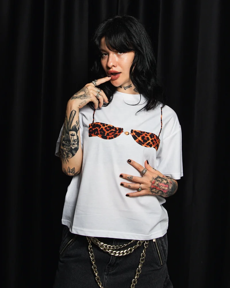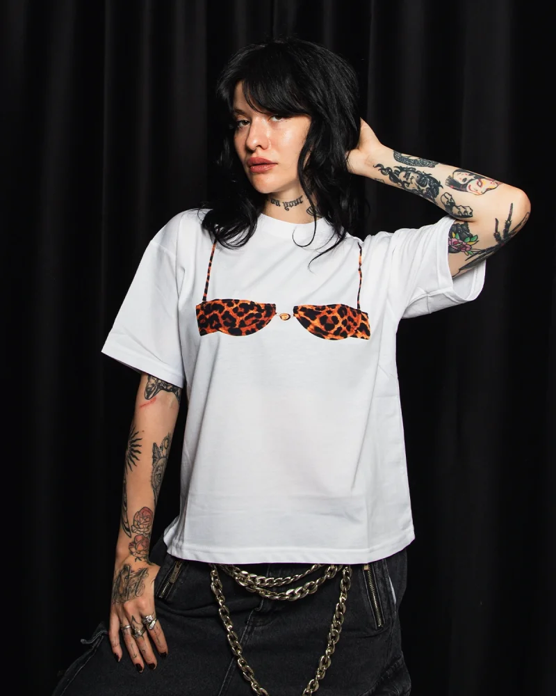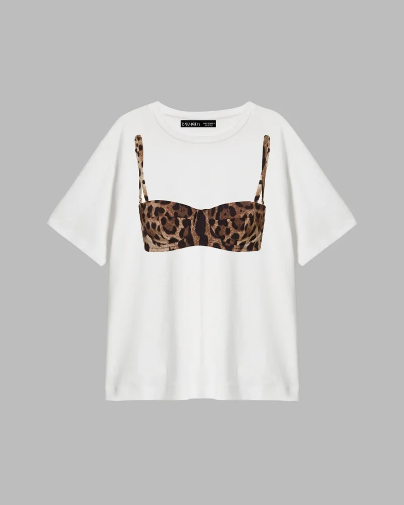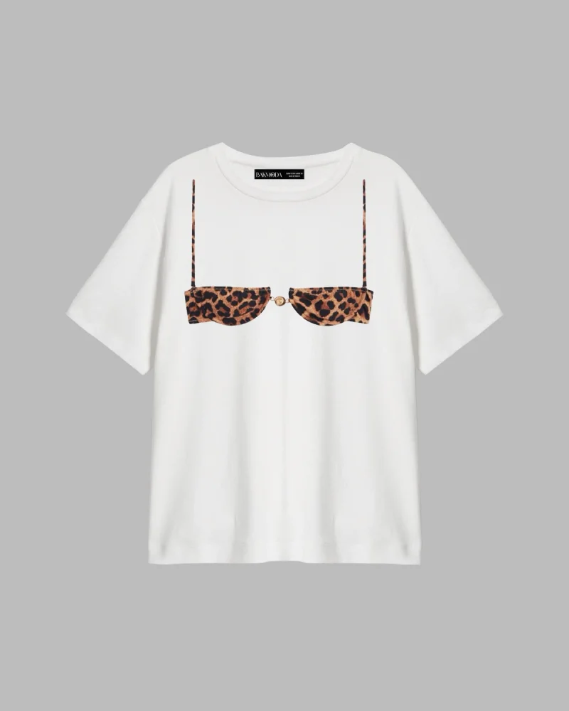 Leopard Tiny Bikini Baskılı Relaxed Fit Beyaz Kadın Tshirt