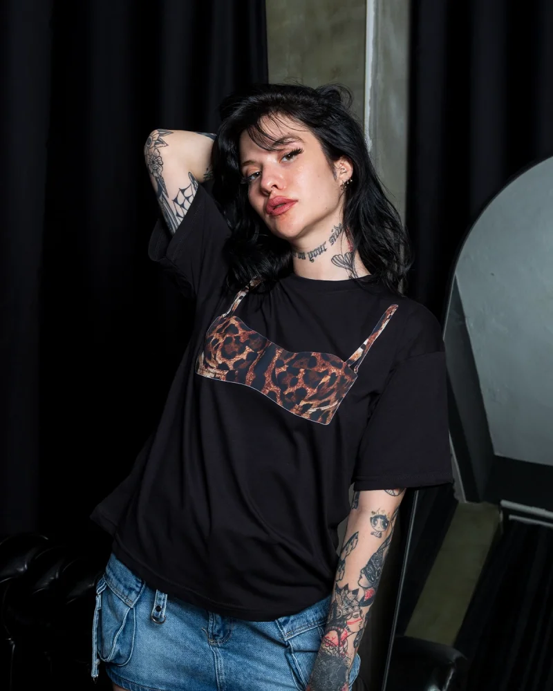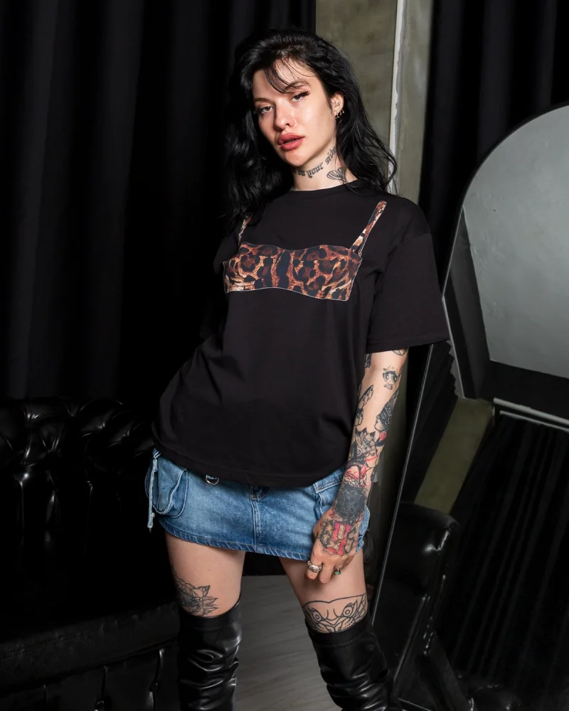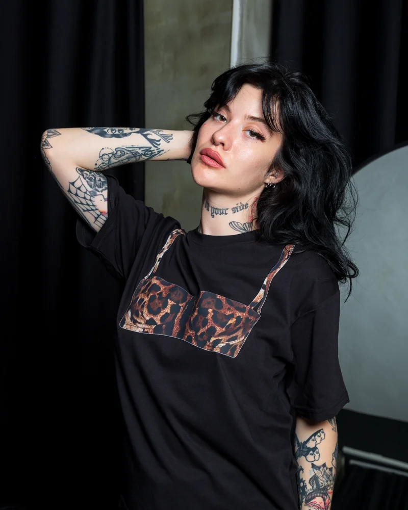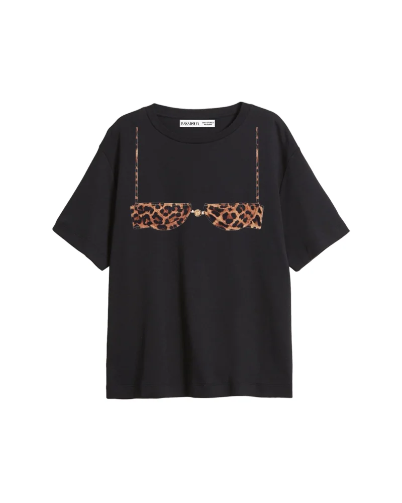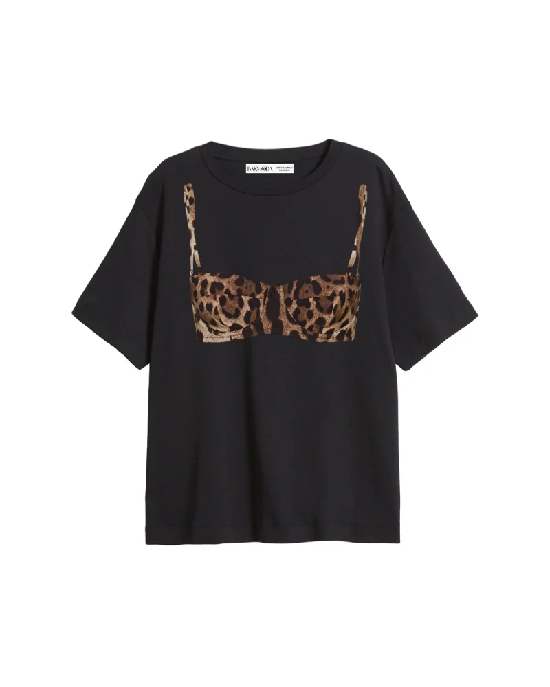 Leopard Tiny Bikini Baskılı Relaxed Fit Siyah Kadın Tshirt