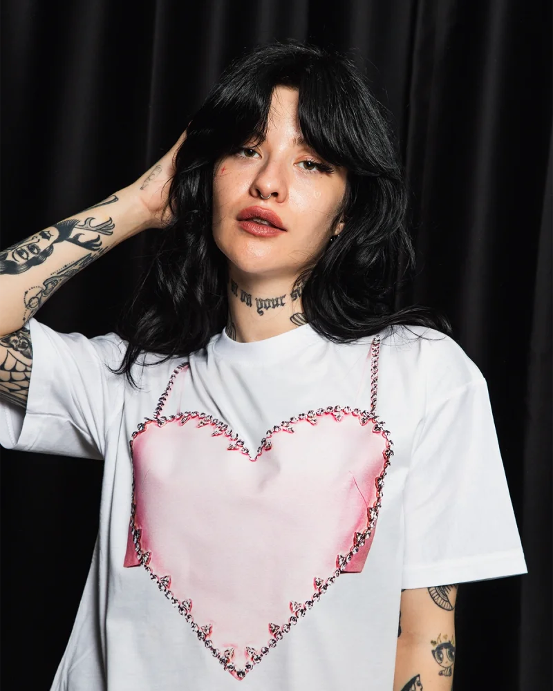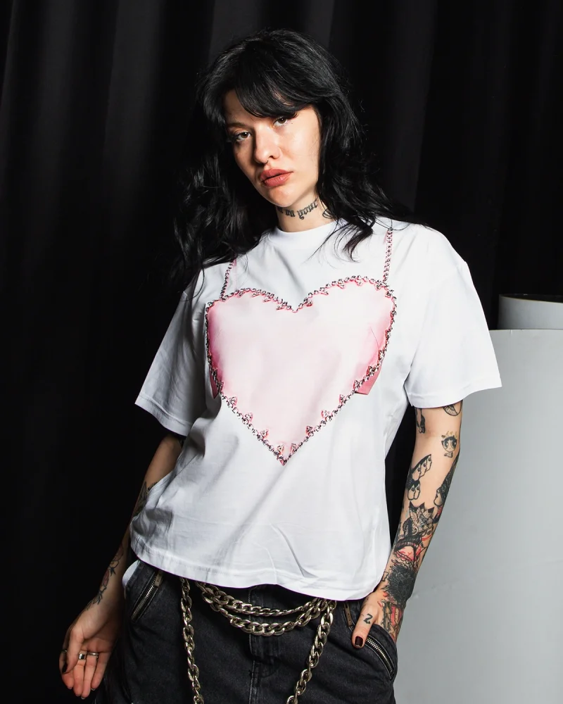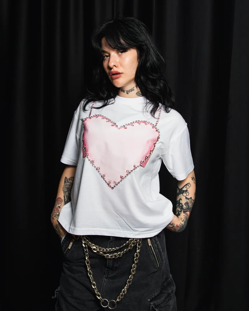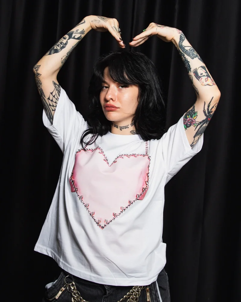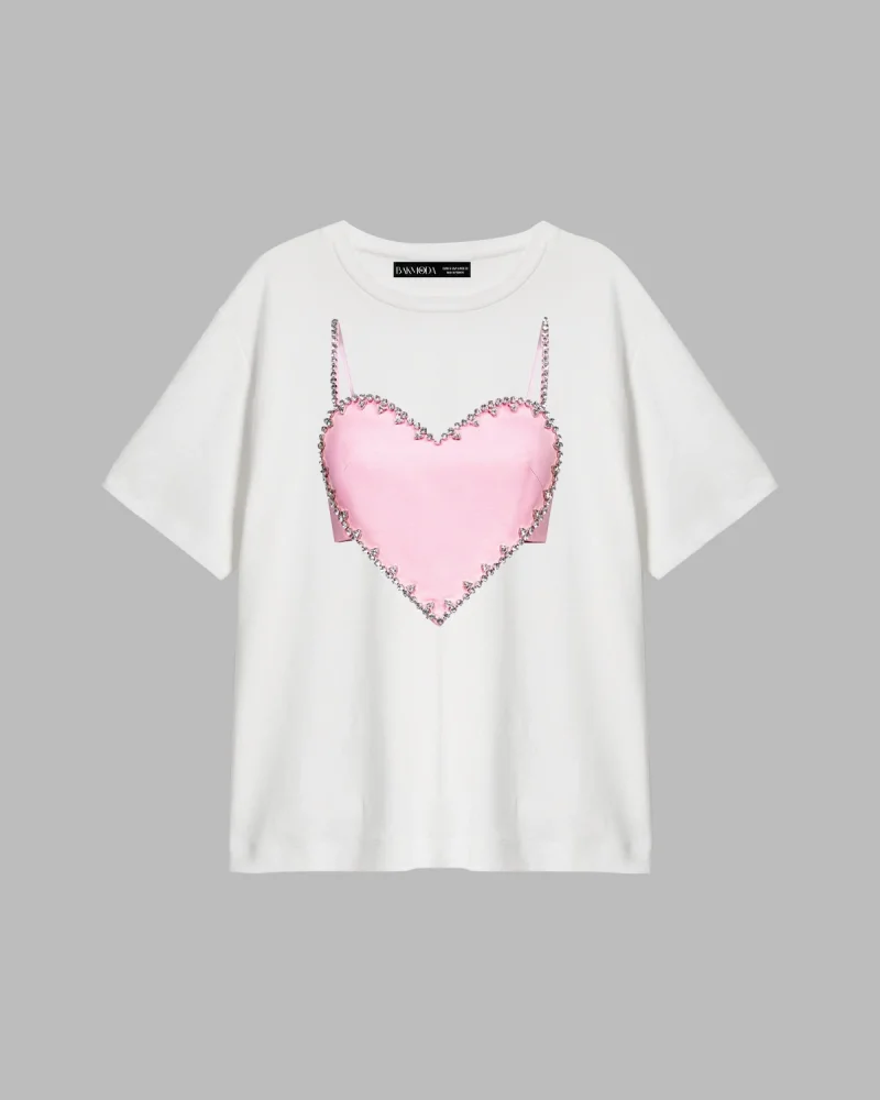 Pink Heart Baskılı Relaxed Fit Beyaz Kadın Tshirt
