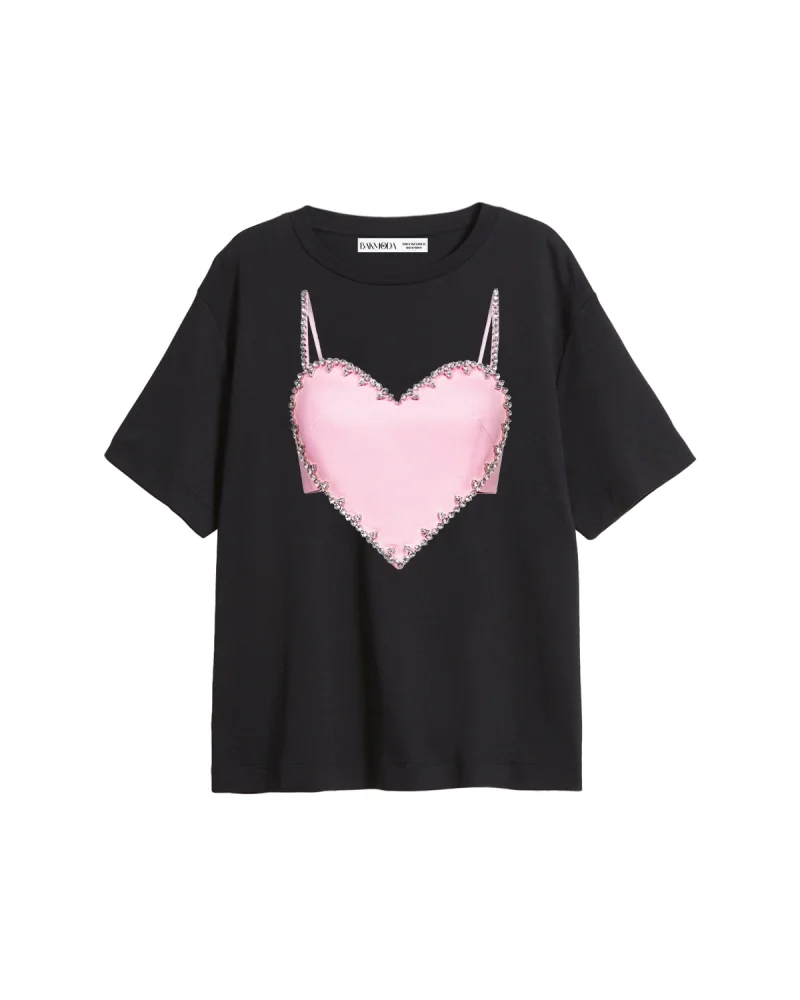 Pink Heart Baskılı Relaxed Fit Siyah Kadın Tshirt