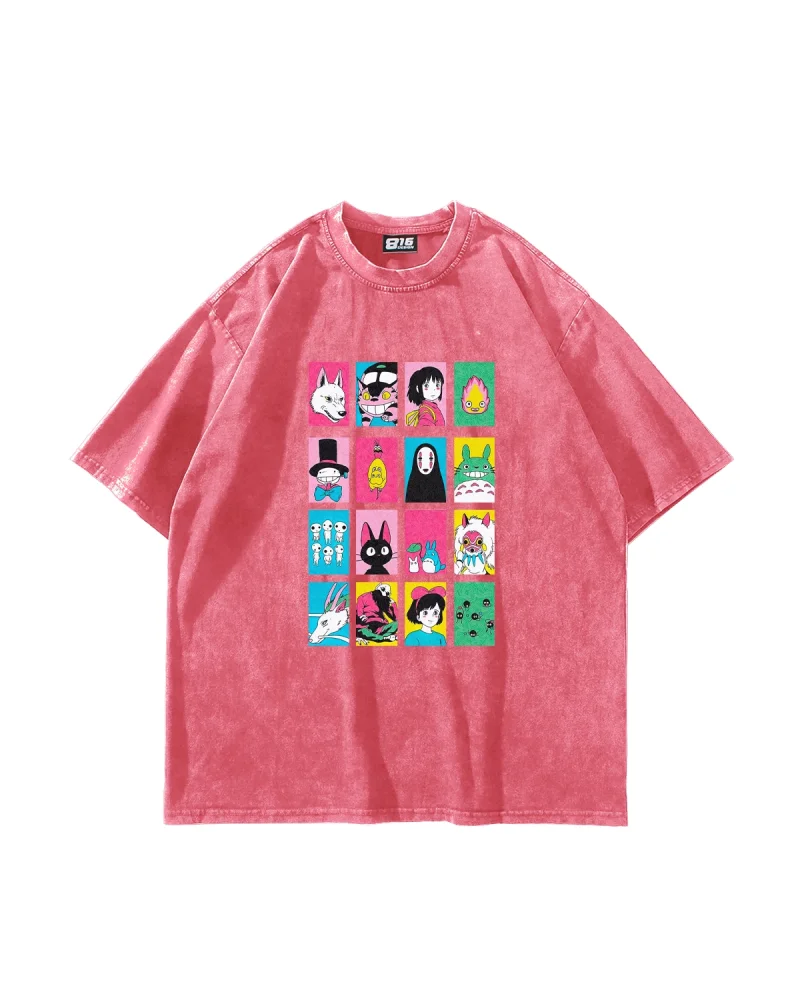 Ghibli Baskılı Oversize Unisex Yıkamalı Pembe Tshirt