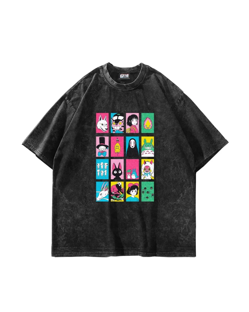 Ghibli Baskılı Oversize Unisex Yıkamalı Siyah Tshirt