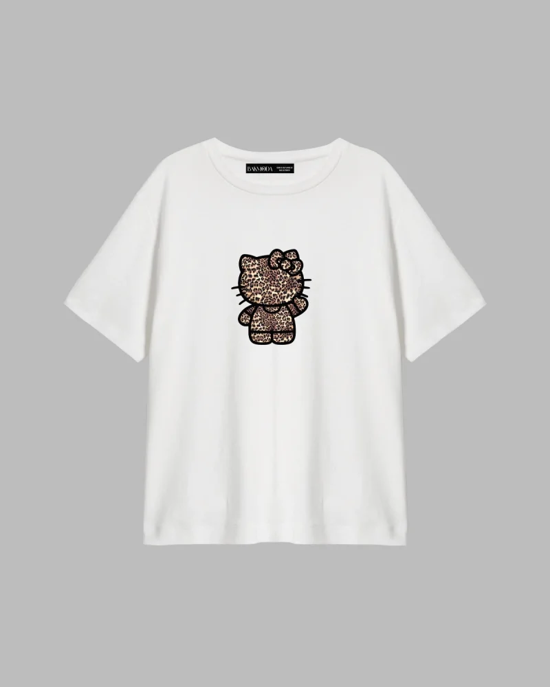 Leopard Kitty Baskılı Relaxed Fit Beyaz Kadın Tshirt