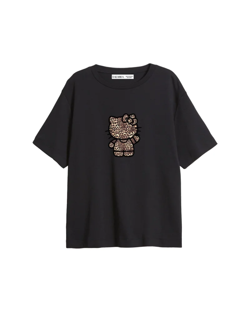 Leopard Kitty Baskılı Relaxed Fit Siyah Kadın Tshirt