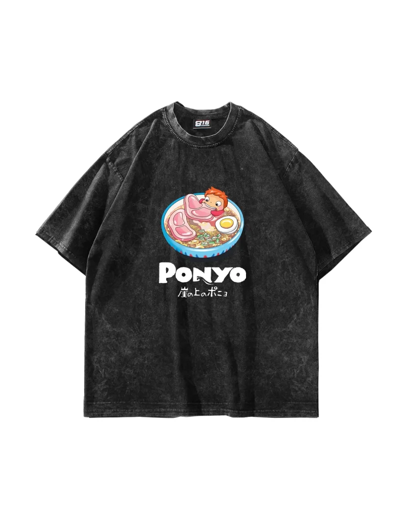 Ponyo Baskılı Oversize Unisex Yıkamalı Siyah Tshirt