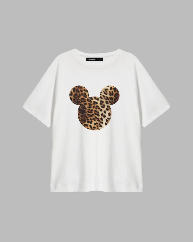 Leopard Mcky Baskılı Relaxed Fit Beyaz Kadın Tshirt