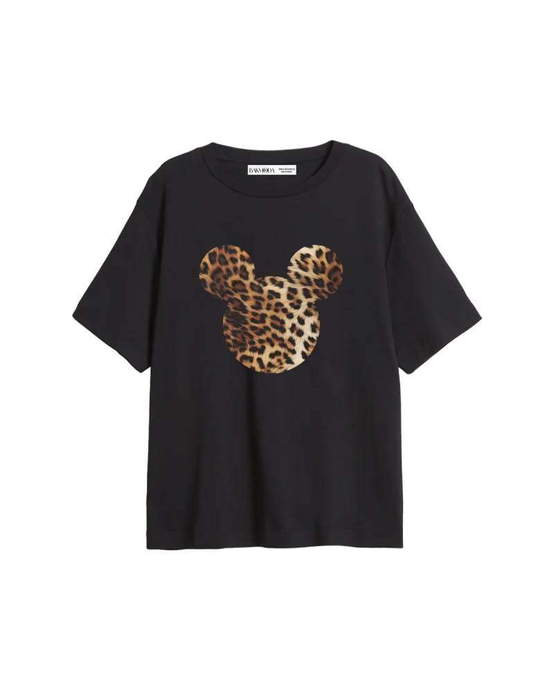 Leopard Mcky Baskılı Relaxed Fit Siyah Kadın Tshirt