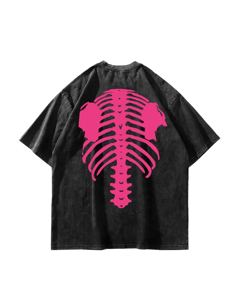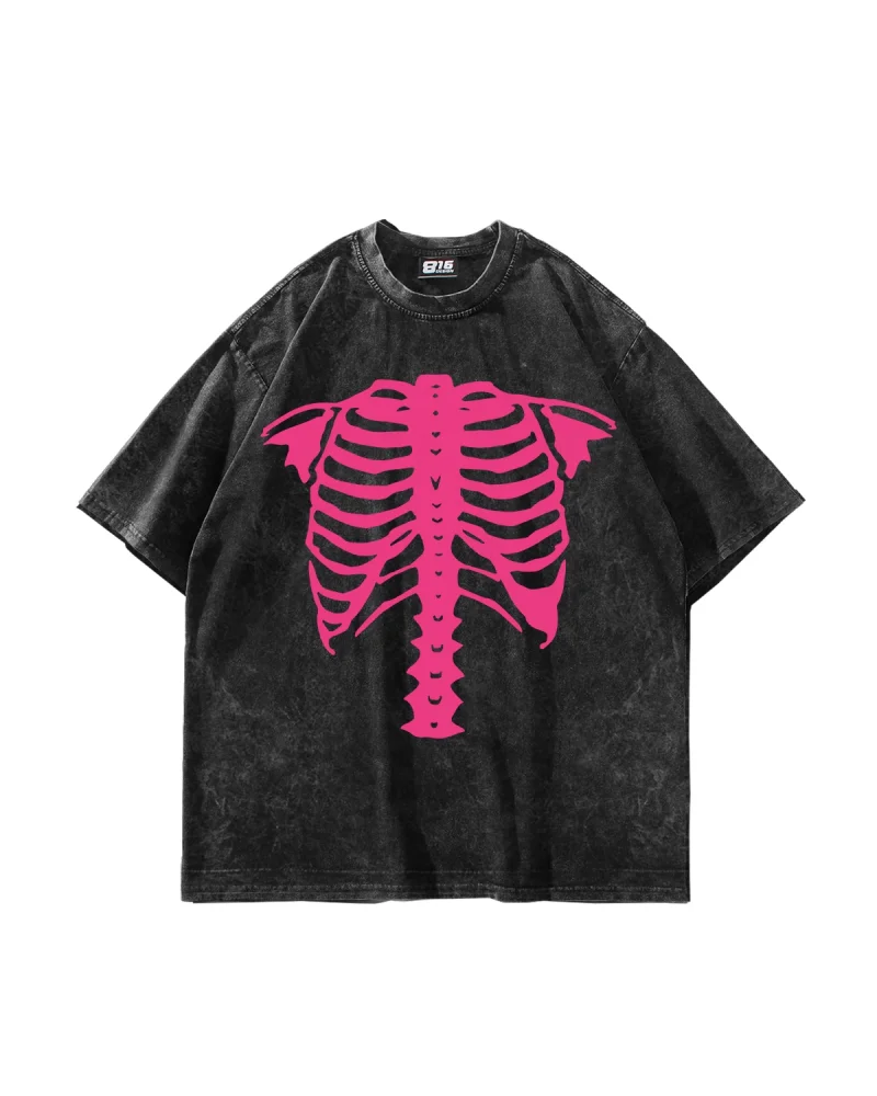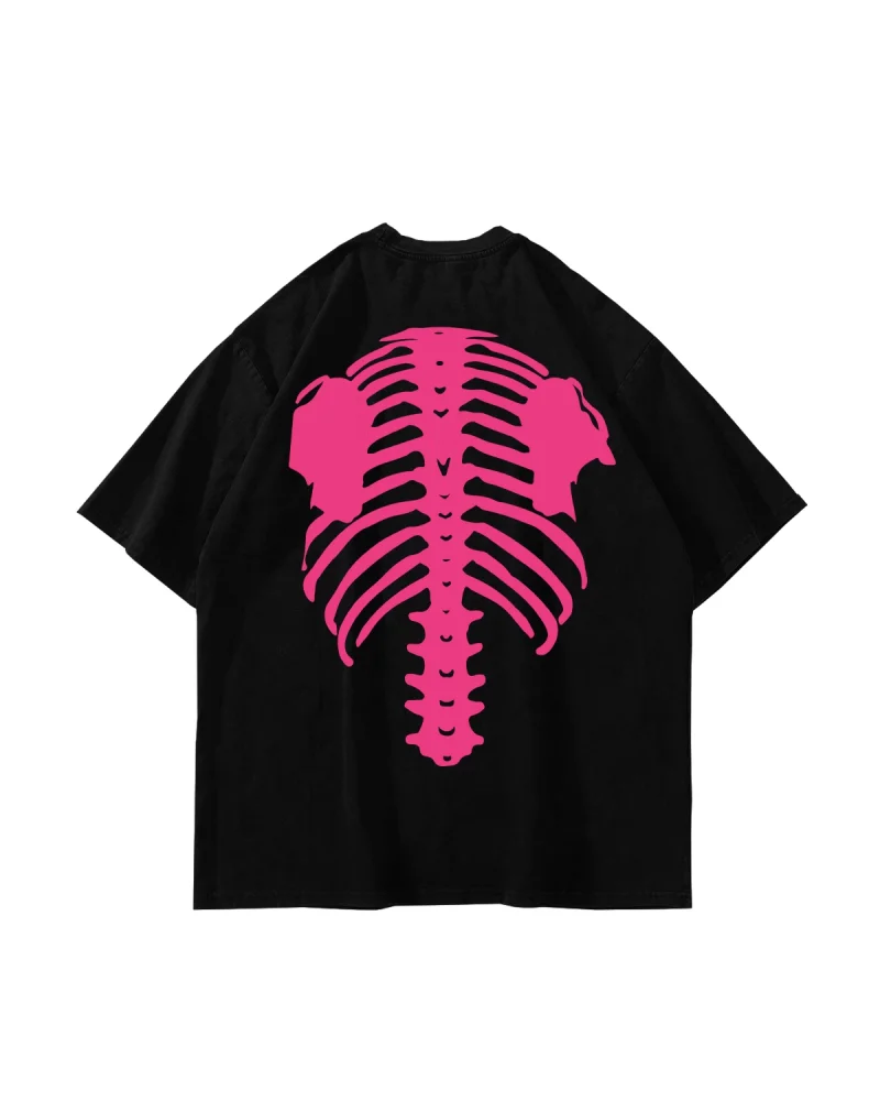 Pink Ribcage Baskılı Oversize Unisex Yıkamalı Siyah Tshirt