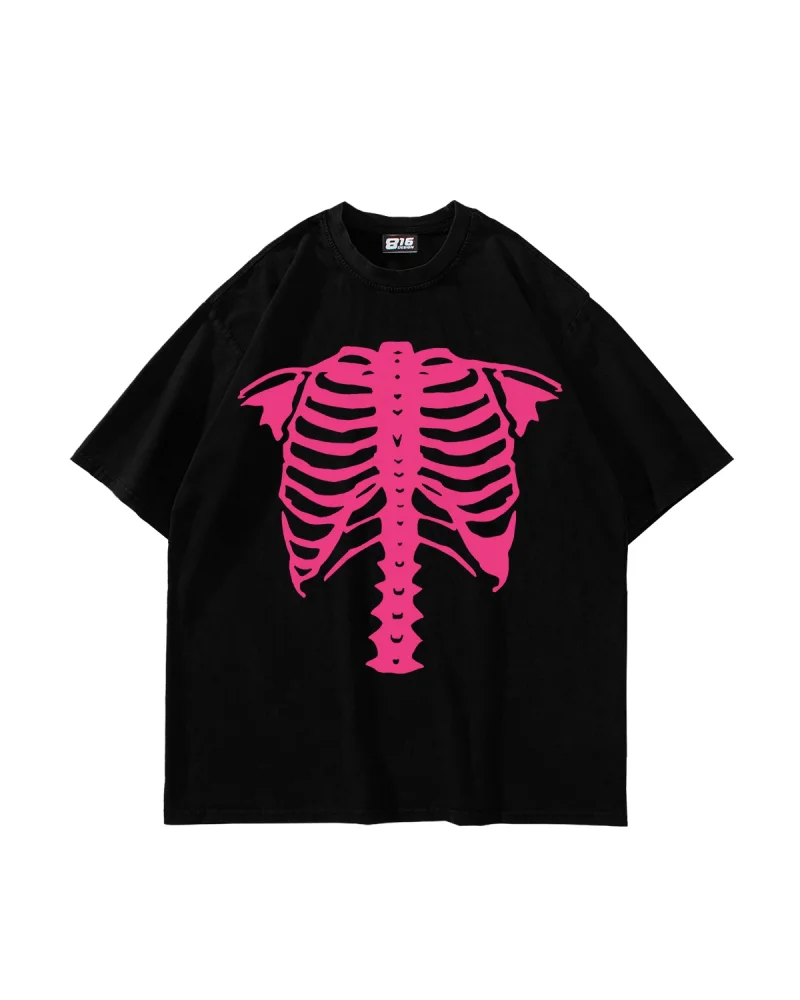 Pink Ribcage Baskılı Oversize Unisex Siyah Tshirt