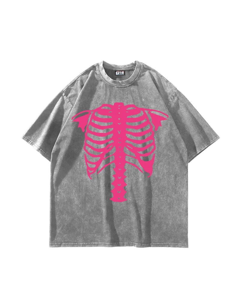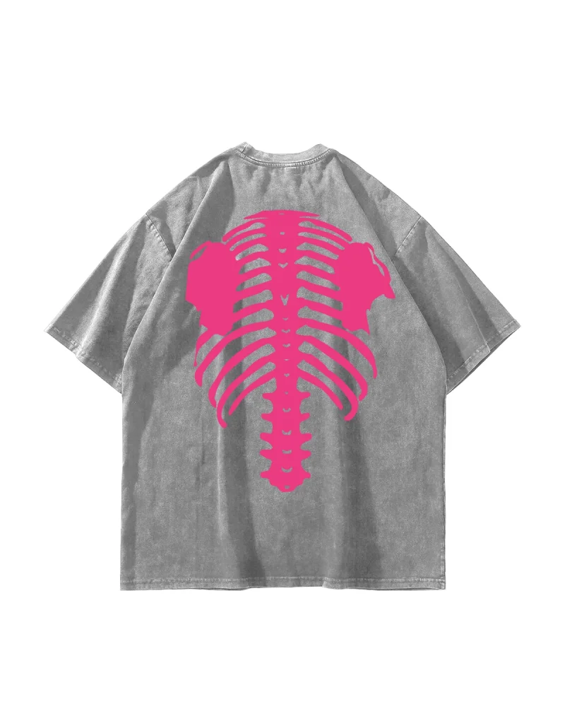 Pink Ribcage Baskılı Oversize Unisex Yıkamalı Beyaz Tshirt
